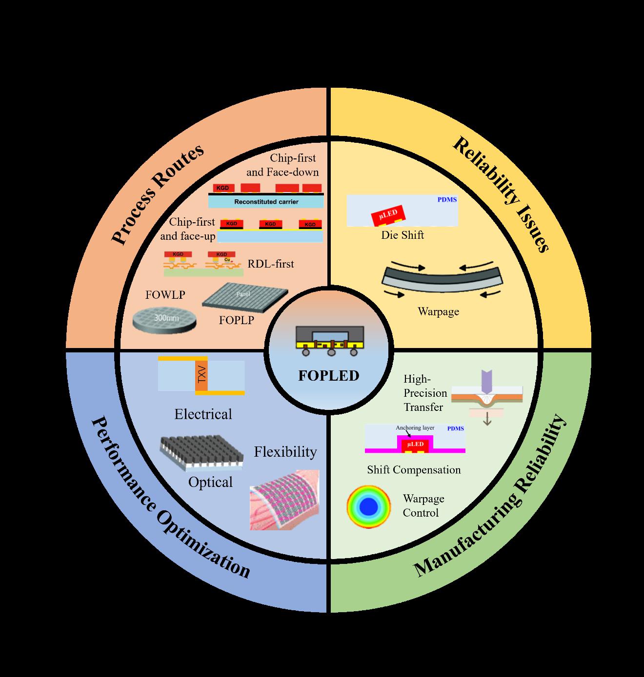 2.在制造过程可靠性方面:从高精度芯片转移技术、芯片偏移补偿策略及翘曲控制三个维度,综述了提升 LED 扇出封装制造过程可靠性的相关研究进展。