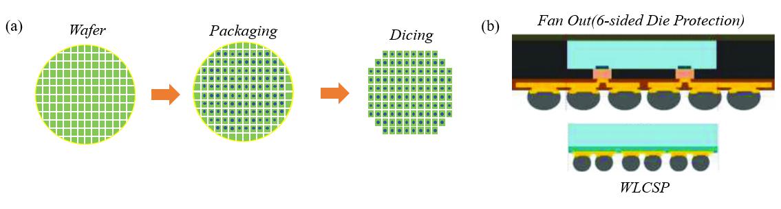 图2. (a) 晶圆级封装(WLP)的工艺流程;(b) 扇出封装(FOP)与晶圆级芯片尺寸封装(WLCSP,即扇入封装(FIP)的一种典型形式)的对比 。
