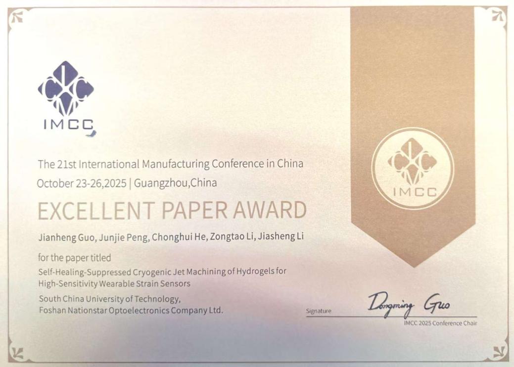 博士生郭剑恒在微纳制造分会发表了题为“Self-Healing-Suppressed Cryogenic Jet Machining of Hydrogels for High-Sensitivity Wearable Strain Sensors”的口头报告。报告中,他介绍了一种利用超低温乙醇射流加工水凝胶的新方法,该方法通过抑制水凝胶的自愈合行为并有效控制切屑形成,成功克服了当前水凝胶微纳加工在材料适用性、精度及工艺复杂度方面的关键限制,实现了百微米级结构的高精度制备。基于该工艺,团队进一步开发出断裂应变超过300%、电阻变化高达440%的高灵敏度液态金属柔性应变传感器,并成功将其应用于人体运动监测。该研究成果荣获本次大会优秀论文奖,指导教师为李家声、李宗涛。