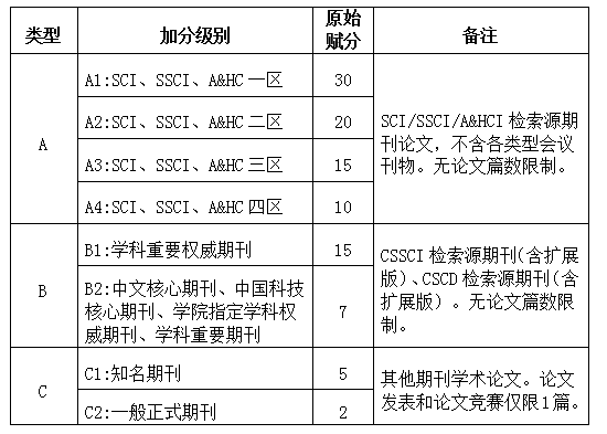 论文发表在期刊时,依据期刊类型等级进行加分。期刊一共分为A、B、C三大类型,每一类型下细分为若干等级,每一等级分别赋予不同的原始加分。C类型的论文发表加分与省级论文竞赛获奖,仅限一篇文章纳入加分范畴。具体情况参见表1。