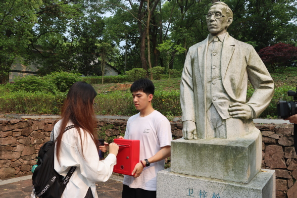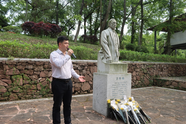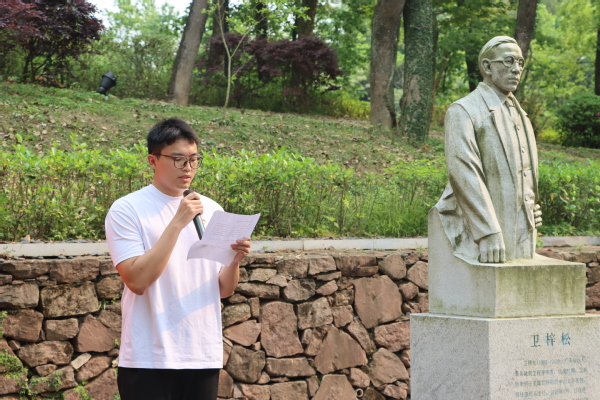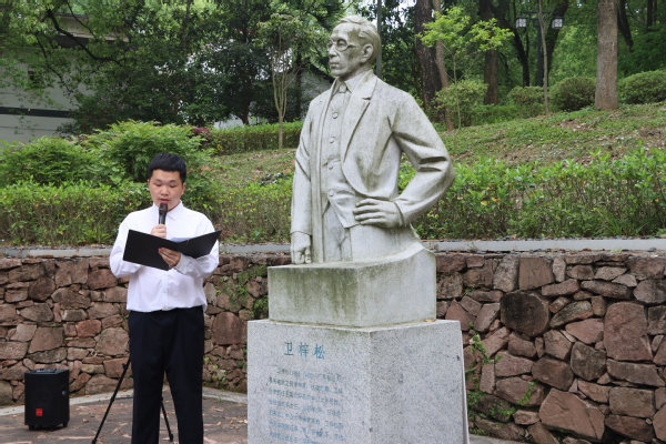 在新村国立中山大学建筑工程系办学纪念地,全体师生于卫梓松先生雕像前整齐肃立,列队庄重肃穆。主持人丁军行深情回顾了国立中山大学建工系西迁坪石、坚守办学的烽火岁月,讲述卫梓松先生坚守民族气节、以身殉国的感人事迹。
