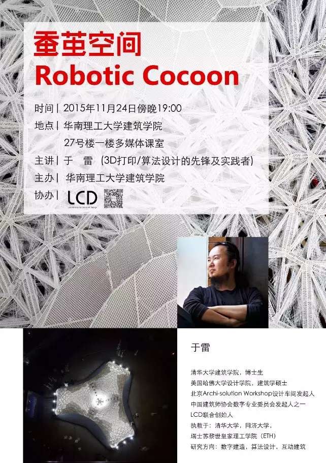 Robotic Cocoon is LCD's long term research in the spatial form of cocoons, where we constantly search for suitable methods for 3D printing its artistic reinterpretations. It extrapolates the form from the cocoon's biological parent body, intranslating the various possibilities, we seek to combine the 3D printing andspatial construction processes with the public activities. It will create an open plan "parent body" that can accommodate various activities for the public.