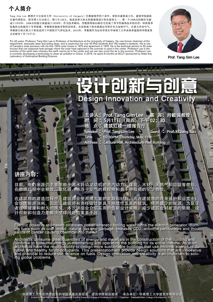 For 40 years,Professor Tang Gim Lee is Professor of Architecture at the University of Calgary. He was former chairman of the department, associate dean and acting dean,and is supervisor for over 40 PhD students and 150 master's students. His is one of Canada's solar pioneers with his first 100% solar house in 1975 and apartment in 1976. He is the technical advisor to 52 solar houses that use seasonal heat storage where the solar heat captured in the summer is used in the winter. Professor Lee is the inventor of the earth tube whereby the earth warms air in the winter and yet can also cools the air in the summer. Professor Lee is currently developing a technology to clean air pollution in China. In 2015,he spent 6-months at SCUT sponsored by State Key Laboratory of Subtropical Building Science.