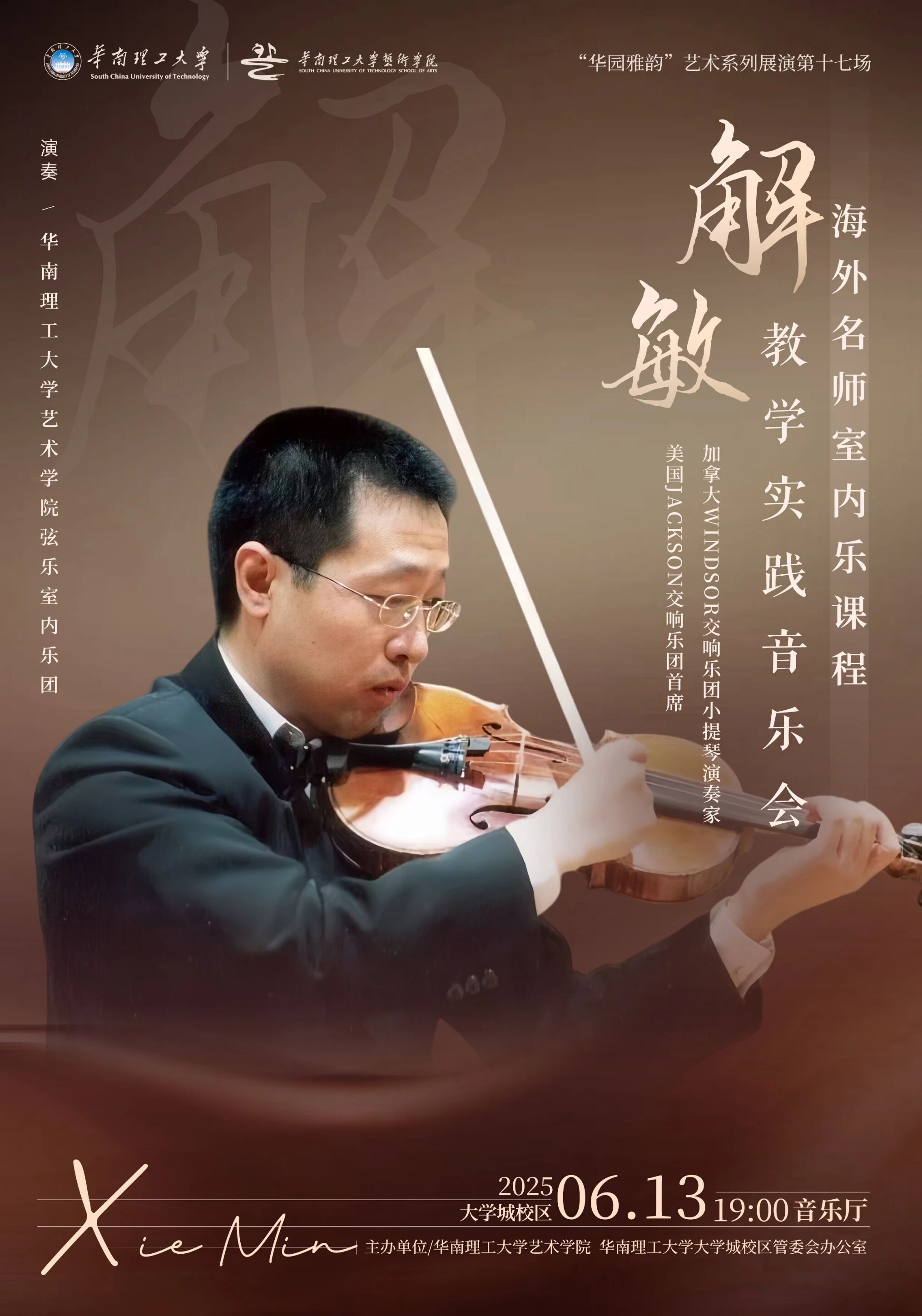 On the evening of June 13, 2025, the 17th installment of the Huayuan Elegance Art Series Performance, Overseas Master program-Teaching practice concert by Xie Min, was held at the SCUT Concert Hall. The concert jointly presented by Dr. Xie Min, along with Wang Yue, Director of the Instrumental Music Department at the School of Arts, Associate Professor Yang Fan, and Kong Lingyi, featured performances by string students from the School of Arts. The program includes string works from the Baroque to mordern period, including well-known pieces by Shostakovich and Bartók, as well as works by lesser-known composers such as Robert Fuchs.