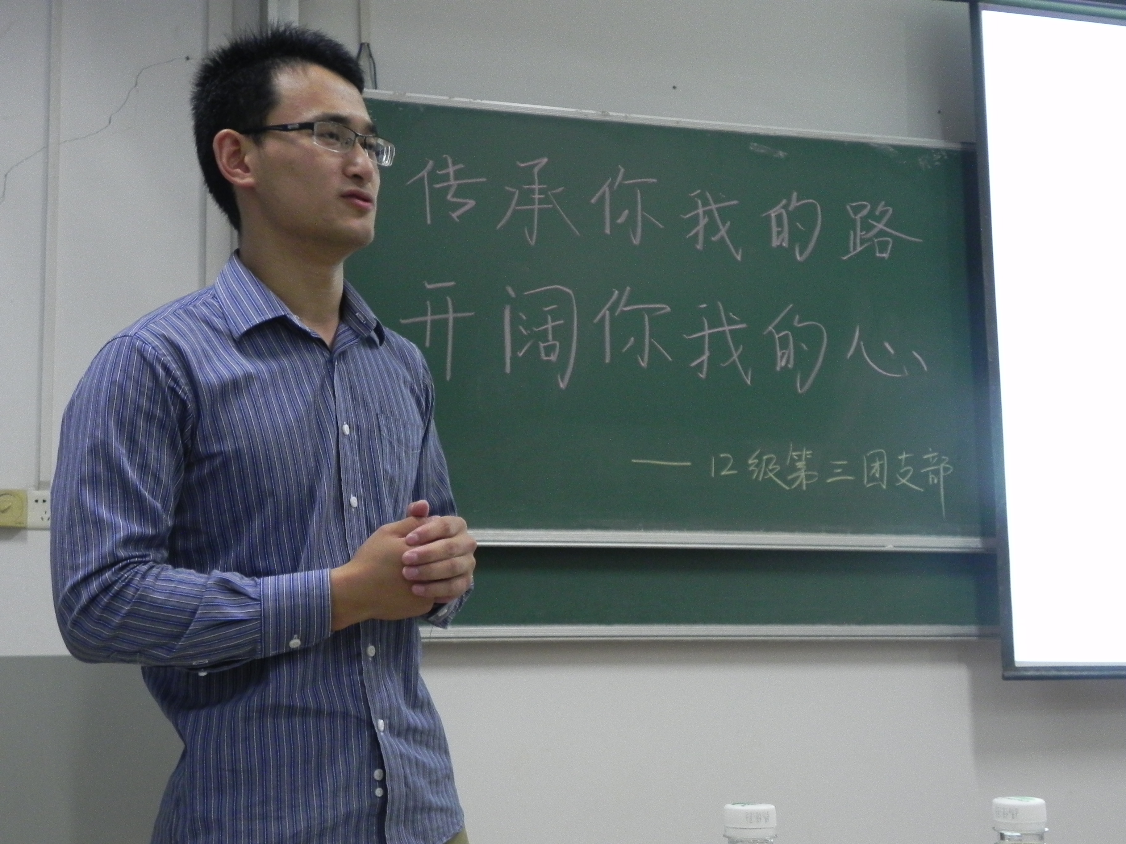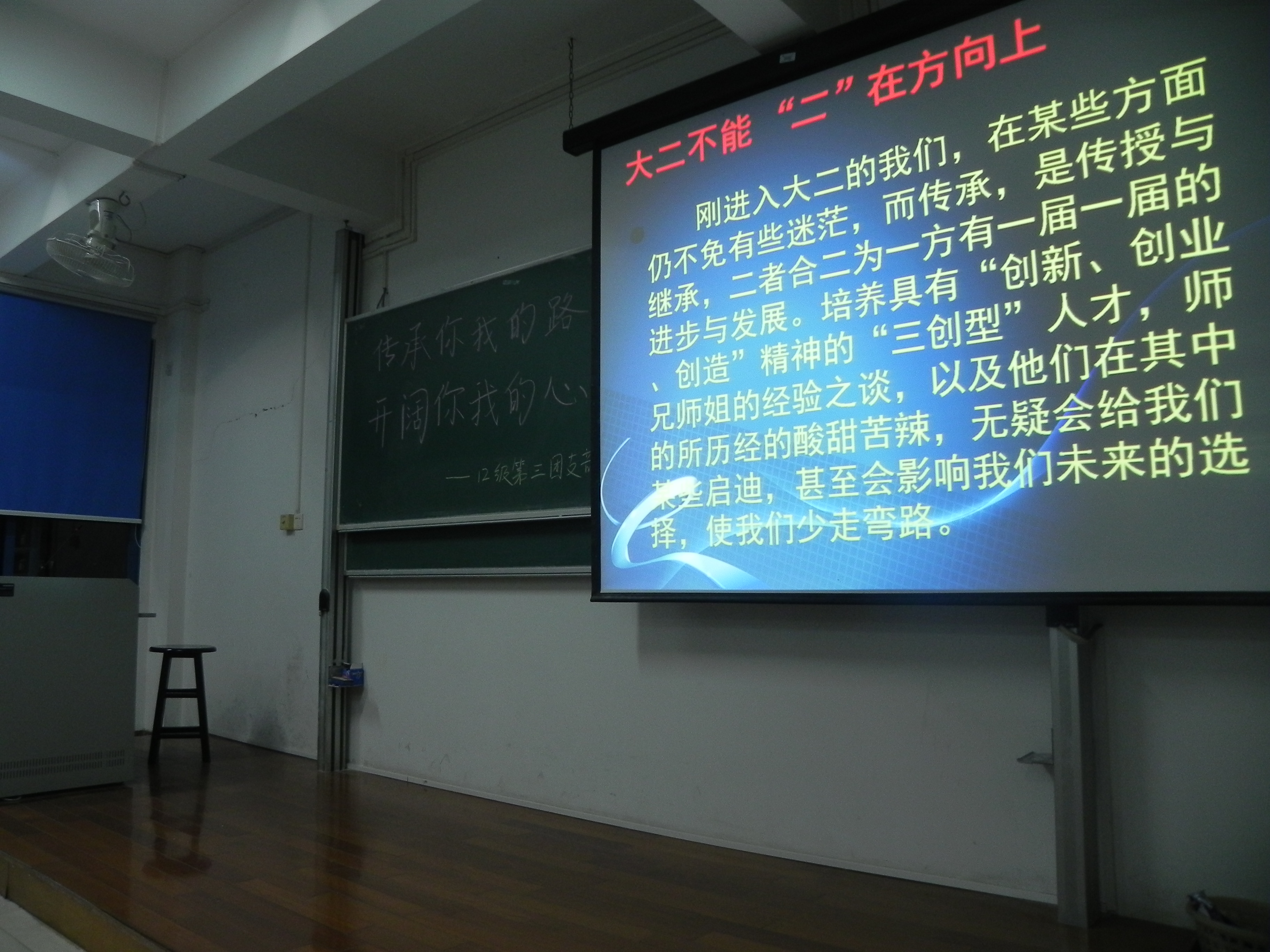 2013年11月23日星期六晚,2012级自动化专业第3团支部在35号楼406举办了2013年华南理工大学“科技文化节“系列活动之“传承你我的路·开阔你我的心”经验交流会。到场分享经验的有研一的李冠霖师兄,11级的庄进发师兄与11级的陈坚鸿。