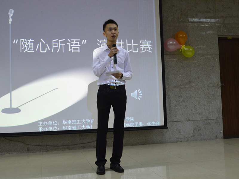 2015年12月12日晚,自动化科学与工程学院随心所欲演讲大赛在华南理工大学大学城校区空中课室举行。受邀嘉宾有自动化科学与工程学院15级辅导员李旺老师,K歌之王决赛冠军田震遇同学。评委有首届自动化学院TED演讲比赛冠军汪远;首届广东省地税杯大学生演讲比赛一等奖得主刘雨熹;第二届华工演说家比赛12强选手曹睿和12强选手石漫。