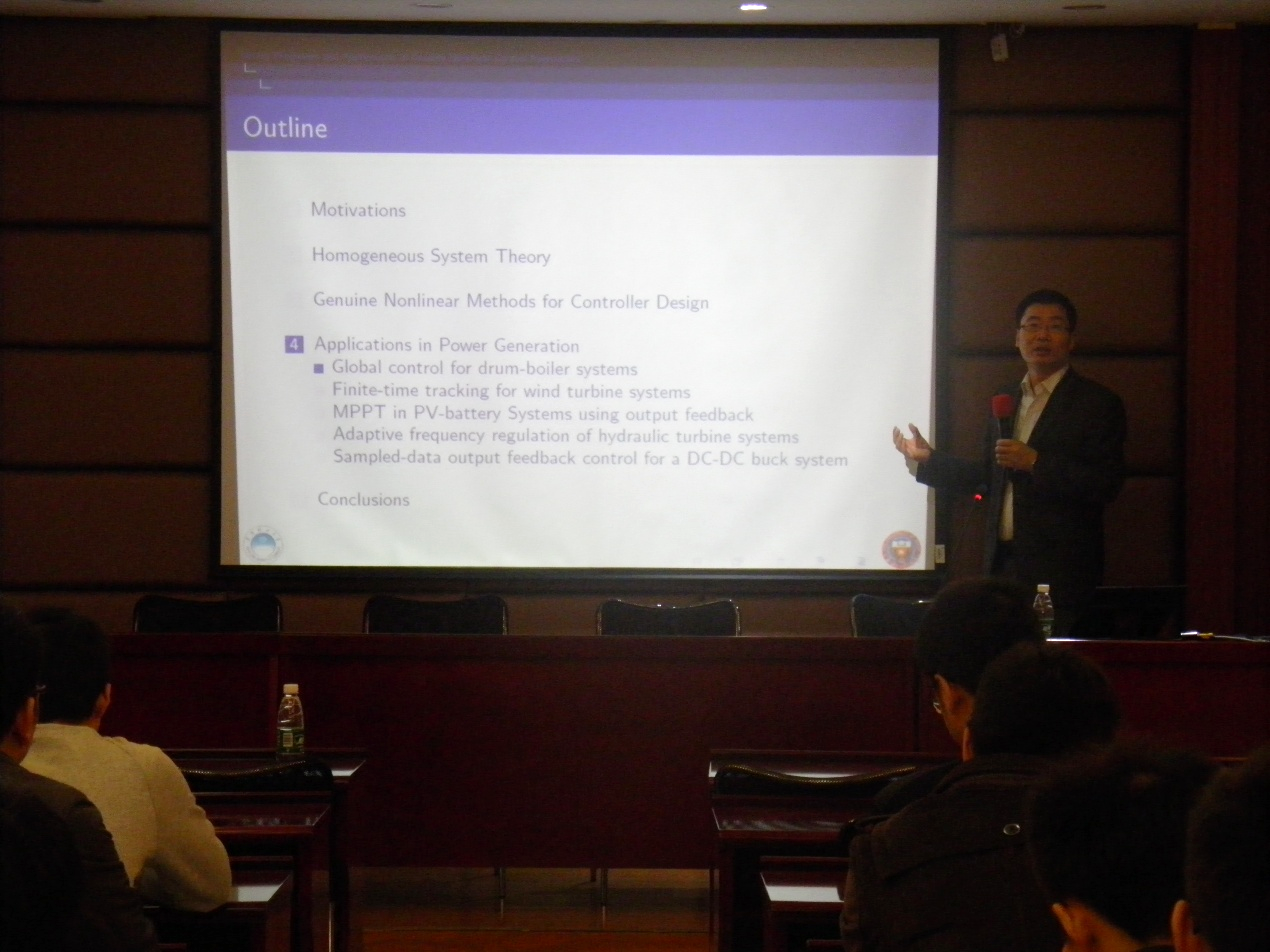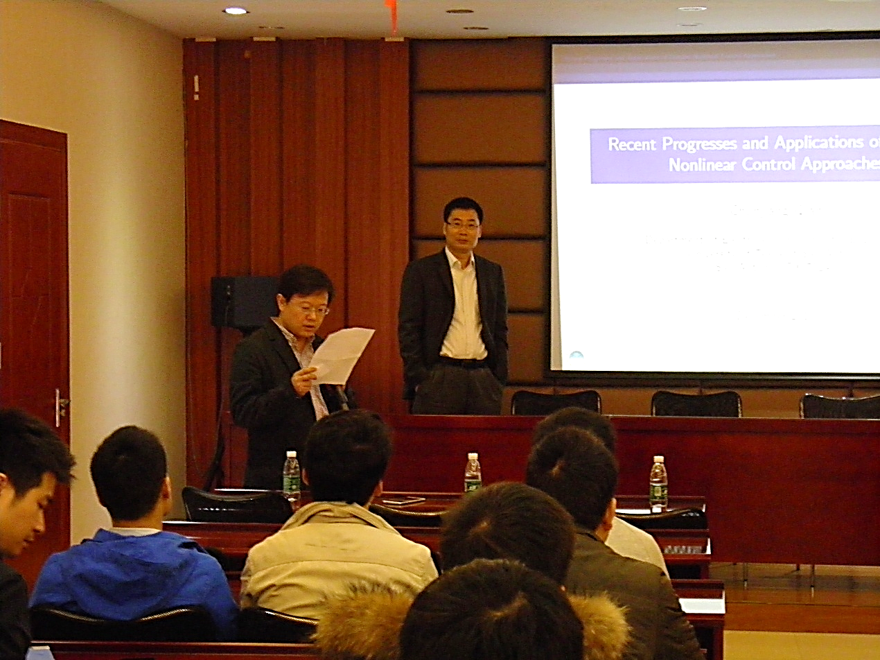 在报告会开始之前,李教授对演讲嘉宾作了简要介绍,钱春江教授在1992年、1994年分别获得了复旦大学控制理论的学士和硕士学位,之后获得凯斯西储大学电气工程博士学位,目前钱教授担任德克萨斯大学电气与计算机工程系的系副主任。他目前的研究兴趣包括鲁棒自适应控制,非线性系统理论,最优控制,网络控制系统,发电厂控制,生物医学应用。本次报告,钱教授主要介绍非线性控制方法的最新进展和应用,他从非线性控制的动机、均匀系统理论、控制器设计的非线性方法、发电应用四个发面展开讲述,最后做了一个总结。钱教授的报告表明,基于均匀系统理论的控制器设计中的非线性方法可以提高系统性能,提升效率,在现实系统中扩大了安全工作范围。