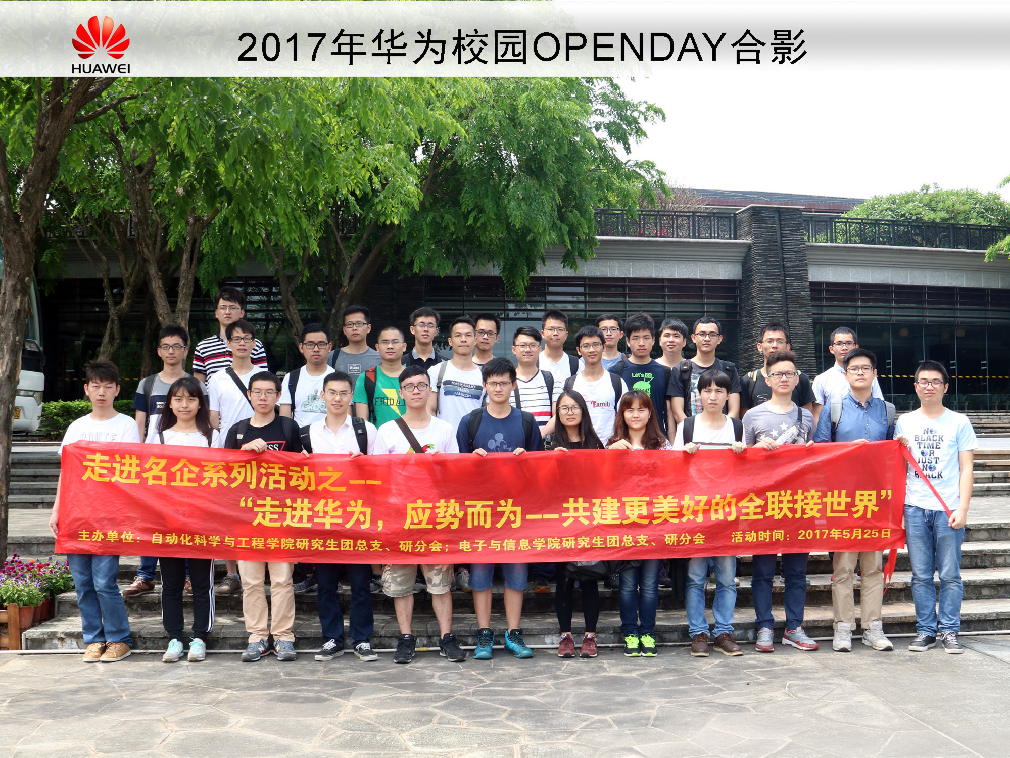 2017年5月25日,由华南理工大学自动化科学与工程学院、电子与信息学院研究生团总支、研分会联合举办的走进名企系列活动之“走进华为,应势而为--共建更美好的全联接世界”在深圳华为全球总部顺利举行。此次活动大家报名热情极高,自动化学院共有72名同学参加华为OPENDAY活动。
