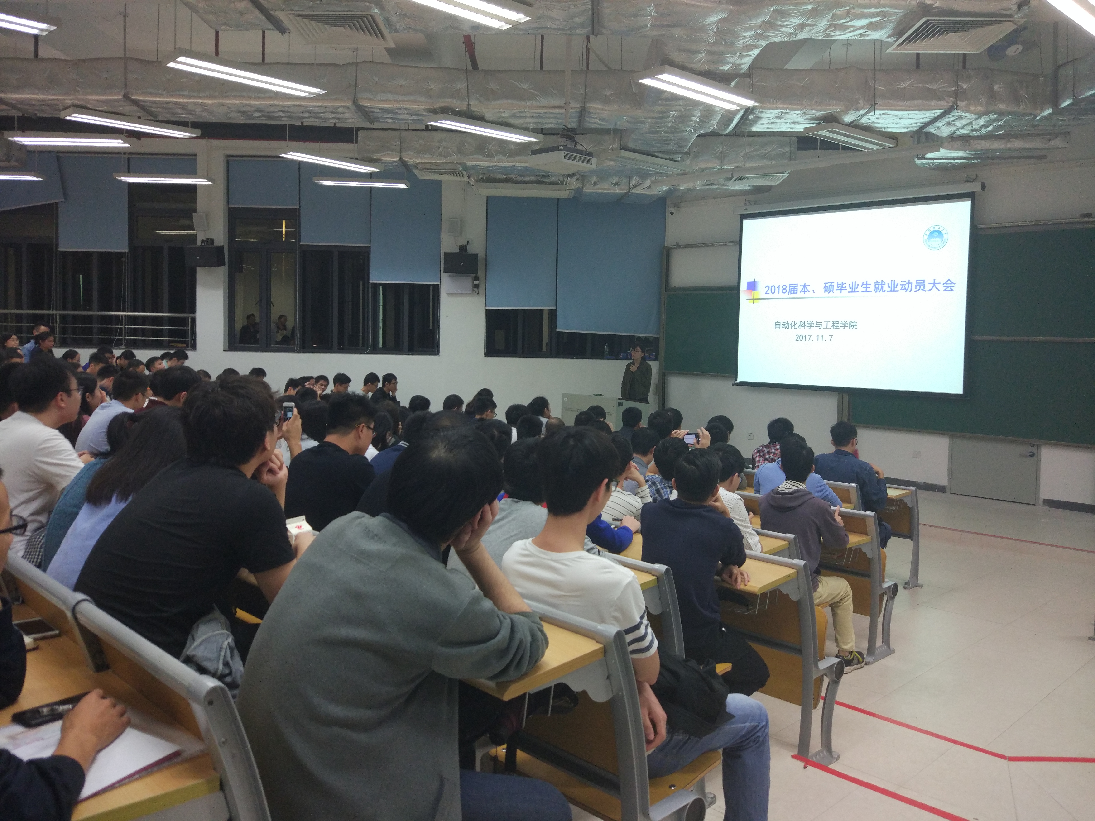 2017年11月7日晚19:00,自动化科学与工程学院2018届本、硕毕业生就业动员大会在博学楼101召开。学院党委刘博副书记、辅导员胡冰玉老师参加会议,2018届全体本、硕毕业生踊跃参会。