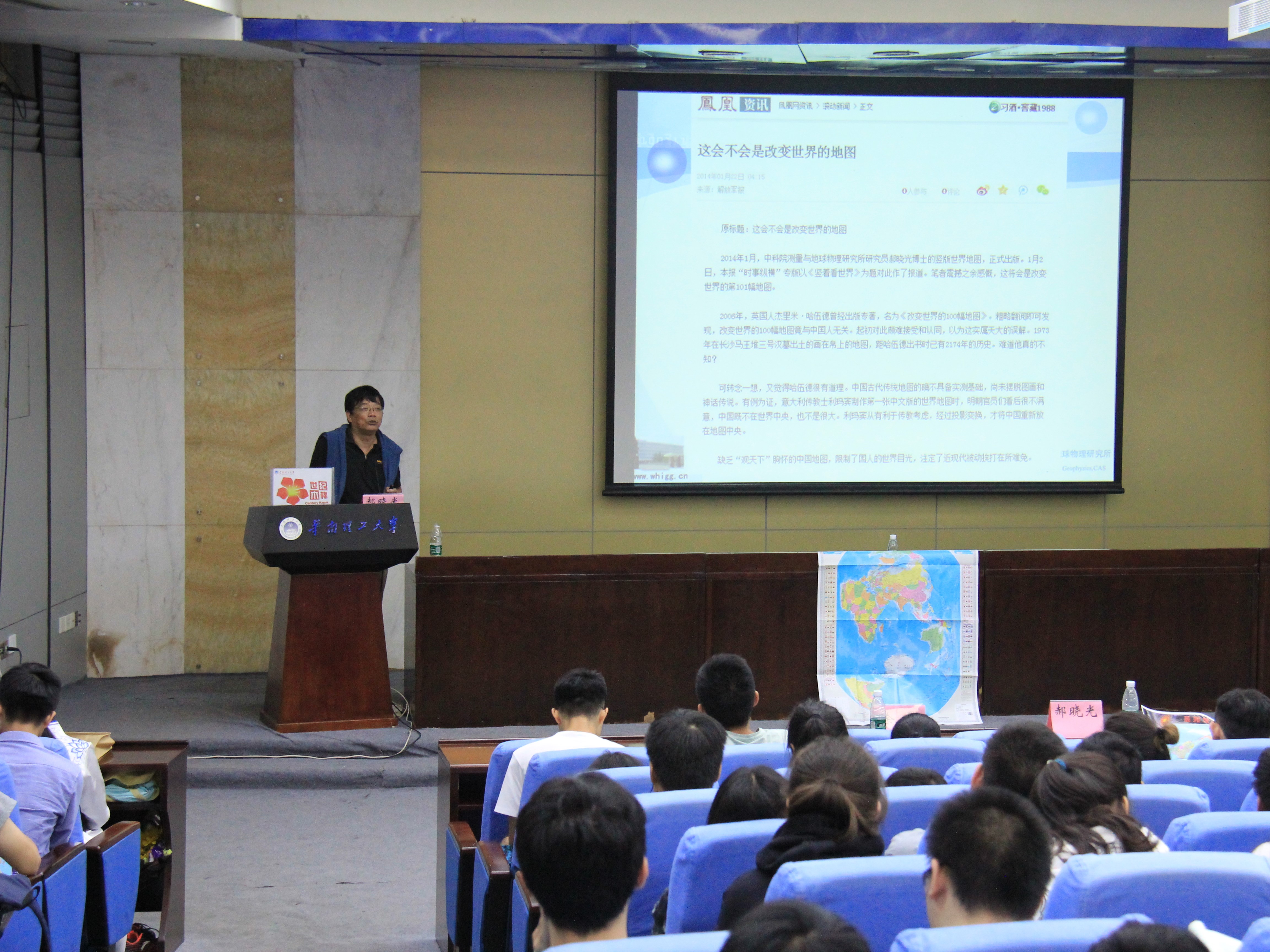 讲座开始之前,郝晓光教授给听众们介绍了他的新编世界地图。接下来开始讲座,首先,郝晓光教授介绍了世界地图的种类,从最早开始的明朝世界地图到现在的世界地图。进而详细讲解了世界地图以经线划分地球仪而得来的世界地图的两个版本,和自己以纬线划分地球仪而得来的新编世界地图的两幅图。通过对比,郝晓光教授把经度和纬度两种划分地球的方法与中国和世界的地理关系展现了出来,悄然带给大家前所未有的“世界观”。接着从张衡“浑天仪”与“地圆说”,郑和七次下西洋与哥伦布发现新大陆,中国明朝后期科技落后与西方科技的崛起这三个例子做比较。进而得出结论:崭新的科学理念必然为我国科技文化的创新和历史使命注入无穷的活力。本次讲座吸引了众多听众,现场座无虚席,在现场提问环节中,听众也积极踊跃地向郝晓光博士提问,郝晓光博士也耐心地解答了大家的困惑。