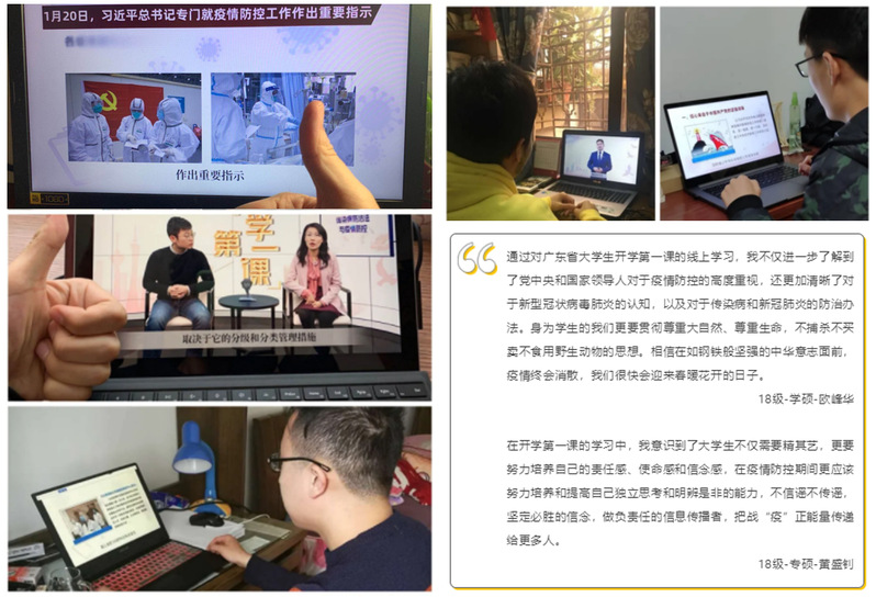 3月4日至5日,我院组织研究生党员进行了新型冠状病毒肺炎疫情防控期间广东省大学生“开学第一课”的线上学习,共有128人参加在线学习,并且积极交流讨论感想。同学们纷纷感叹疫情阴霾下强大的中国力量、凝聚的中国精神和极高的中国效率,也坚信在这次战役中中国人民能够取得必然的胜利。作为当代大学生党员,同学们意识到疫情期间更要提高自己的责任感和使命感,提高公共卫生意识的同时,也在思考如何利用自己的所作所学为公共卫生事业贡献力量。