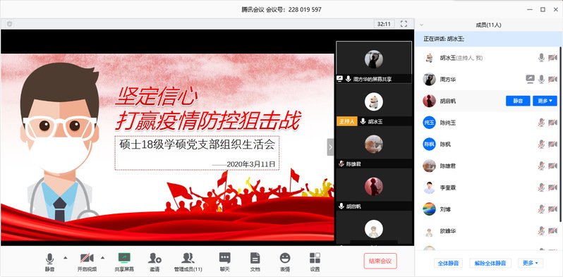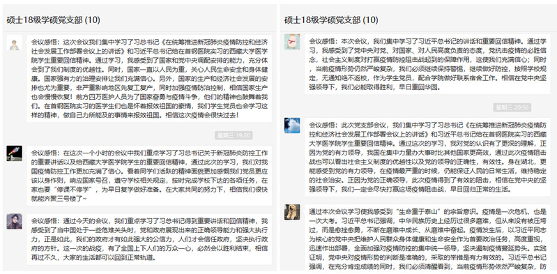3月11日下午,研究生辅导员组织硕士18级学硕党支部开展了“坚定信心 打赢疫情防控阻击战”为主题的“云”支部组织生活会,刘博副书记和党支部全体党员参会。会议深入学习了习近平总书记《在统筹推进新冠肺炎疫情防控和经济社会发展工作部署会议上的讲话》和习近平总书记给在首钢医院实习的西藏大学医学院学生重要回信精神。刘书记传达了近期学校防疫相关工作要求,勉励大家要坚定理想信念,充分发挥党员的先锋模范带头作用,积极配合学校和学院相关工作,以实际行动为早日战胜疫情贡献自身的力量。