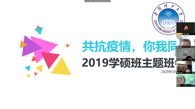 3月19日下午15:00,研究生辅导员胡冰玉组织自动化学院2019级学硕班在“腾讯会议”平台召开“共抗疫情你我同行”主题班会,华南理工大学校长助理、华南协同创新研究院张明,学院党委副书记刘博,班主任彭云建老师,和全班同学参加会议。