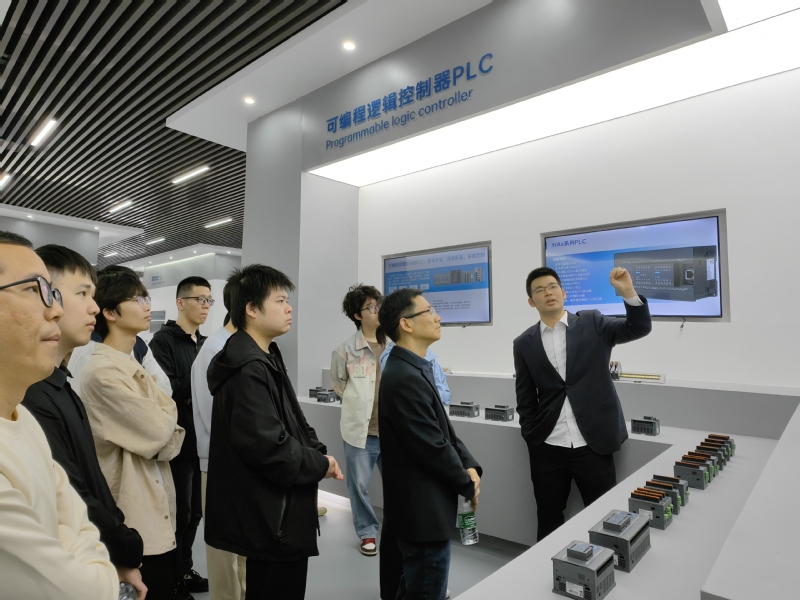展厅里陈列着公司全系列核心产品,宋知巍先生向同学们详细介绍了不同产品针对的应用需求,所包含的设计理念、制造工艺、自动化专业知识及未来革新方向,让同学们真正了解到专业知识转化为实际产品的全过程,激起了同学们浓厚的兴趣。作为一家解决方案供应商,显控科技亦会根据客户需求提供定制化设计,并派技术人员实地调试,切实解决用户需求。