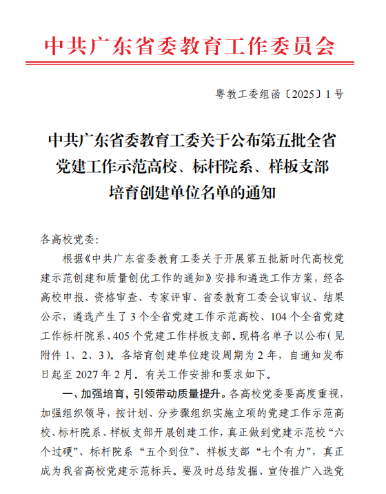 根据《中共广东省委教育工委关于开展第五批新时代高校党建示范创建和质量创优工作的通知》要求,经各高校申报、资格审查、专家评审、省委教育工委会议审议,我院成功入选广东省第五批“全省党建工作标杆院系”培育创建单位,我院本科生第一党支部入选“全省样板支部”培育创建单位。