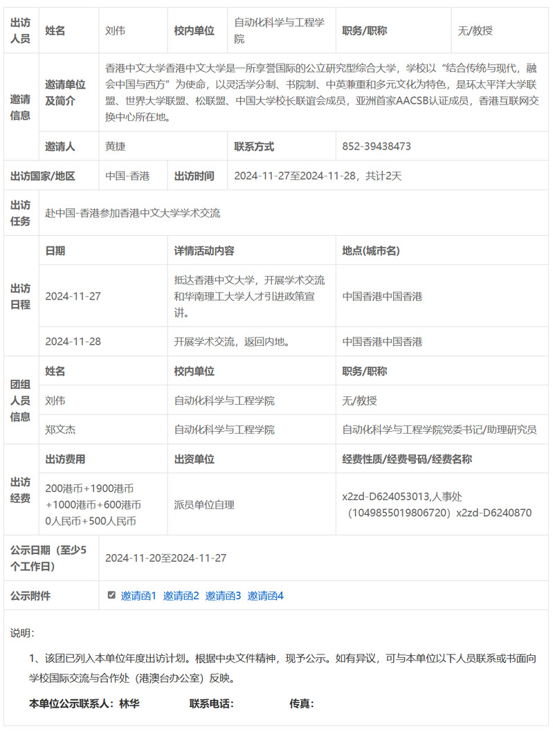 关于刘伟赴中国-香港参加香港中文大学学术交流的公示
