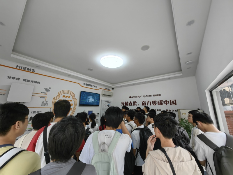 格力电器作为全球知名的家电制造企业,始终以技术创新为核心驱动力。师生一行首先参观了格力“光储直柔”系统解决方案的展示点。工作人员对该项目的创立背景、系统架构、功能设置、应用场景、技术创新与能耗情况等做了全面介绍,通过技术创新,光伏空调从“耗电大户”转变为“能源枢纽”,这项创新让师生们看到了能源革命、响应“碳达峰、碳中和”战略的具体实践。