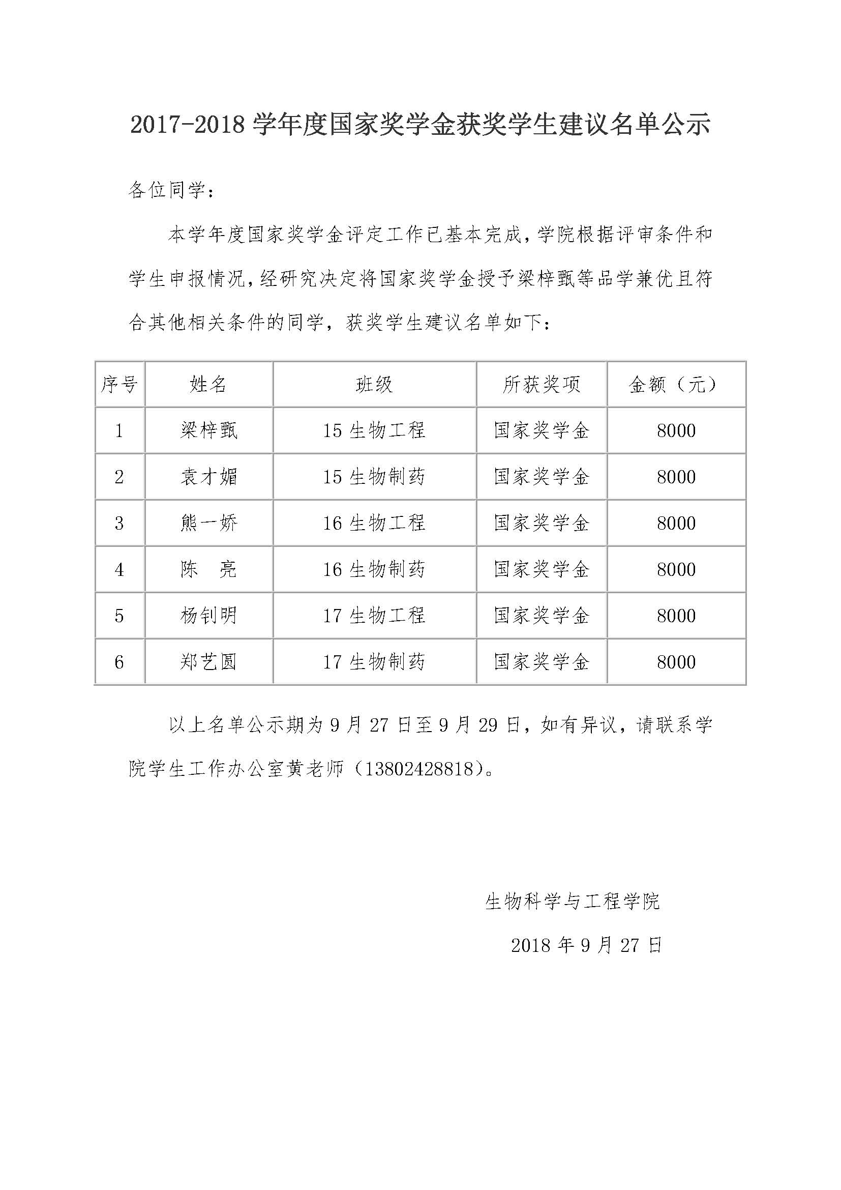 2017-2018学年度国家奖学金获奖学生建议名单公示
