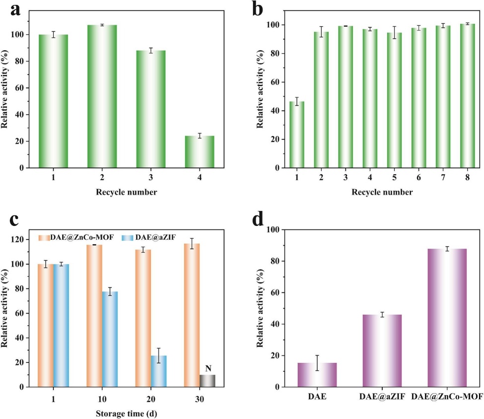 图2 DAE@aZIF和DAE@ZnCo-MOF的稳定性;(a)DAE@aZIF与(b) DAE@ZnCo-MOF可重复使用性;(c)DAE@aZIF与DAE@ZnCo-MOF 的储存稳定性;(d)aZIF与ZnCo-MOF在蛋白酶K处理后的DAE活性