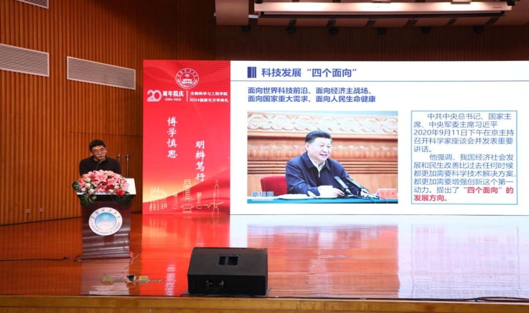 在授课中,熊伟院长从习近平总书记提出科技发展和科技工作者要坚持“四个面向”,习近平总书记提出要大力发展新质生产力和加强基础研究人才队伍建设等切入,为新生们分析了党和国家对生物学科等基础学科的重视和发展规划,介绍了生物学科当前所处的大背景。
