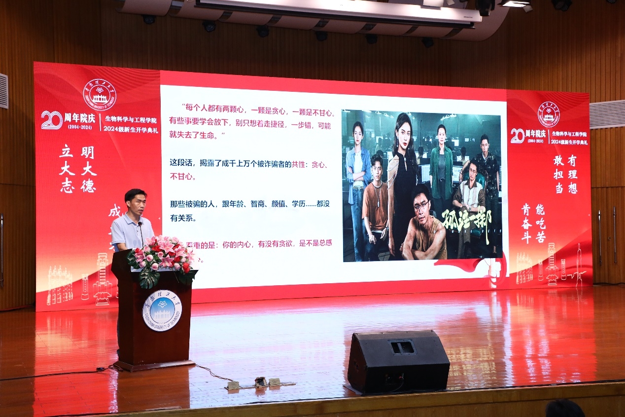 活动开始前,王燕林副书记面向全体新生同学开展反电信诈骗宣传教育。他列举了前期真实被诈骗案例和数据,借用反诈电影《孤注一掷》中台词,强调了诈骗分子关注点正是受害人的“贪心”与“不甘心”。他号召全体新生同学注册广州反诈服务号,安装国家反诈中心APP,提高防范意识,守护自己钱袋子。