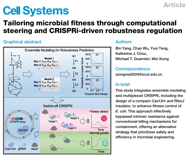 2024年12月11日,华南理工大学与美国国家可再生能源实验室的学者联合在《Cell Systems》期刊上在线发表了题为Tailoring Microbial Fitness Through Computational Steering and CRISPRi-Driven Robustness Regulation的突破性进展,成功开发了一种基于集群建模与CRISPR干扰(CRISPRi)的新型微生物控制策略。该研究为基因改造微生物的安全管理提供了强有力的解决方案,在合成生物学、生态保护和生物工程安全性提升方面具有重要意义。