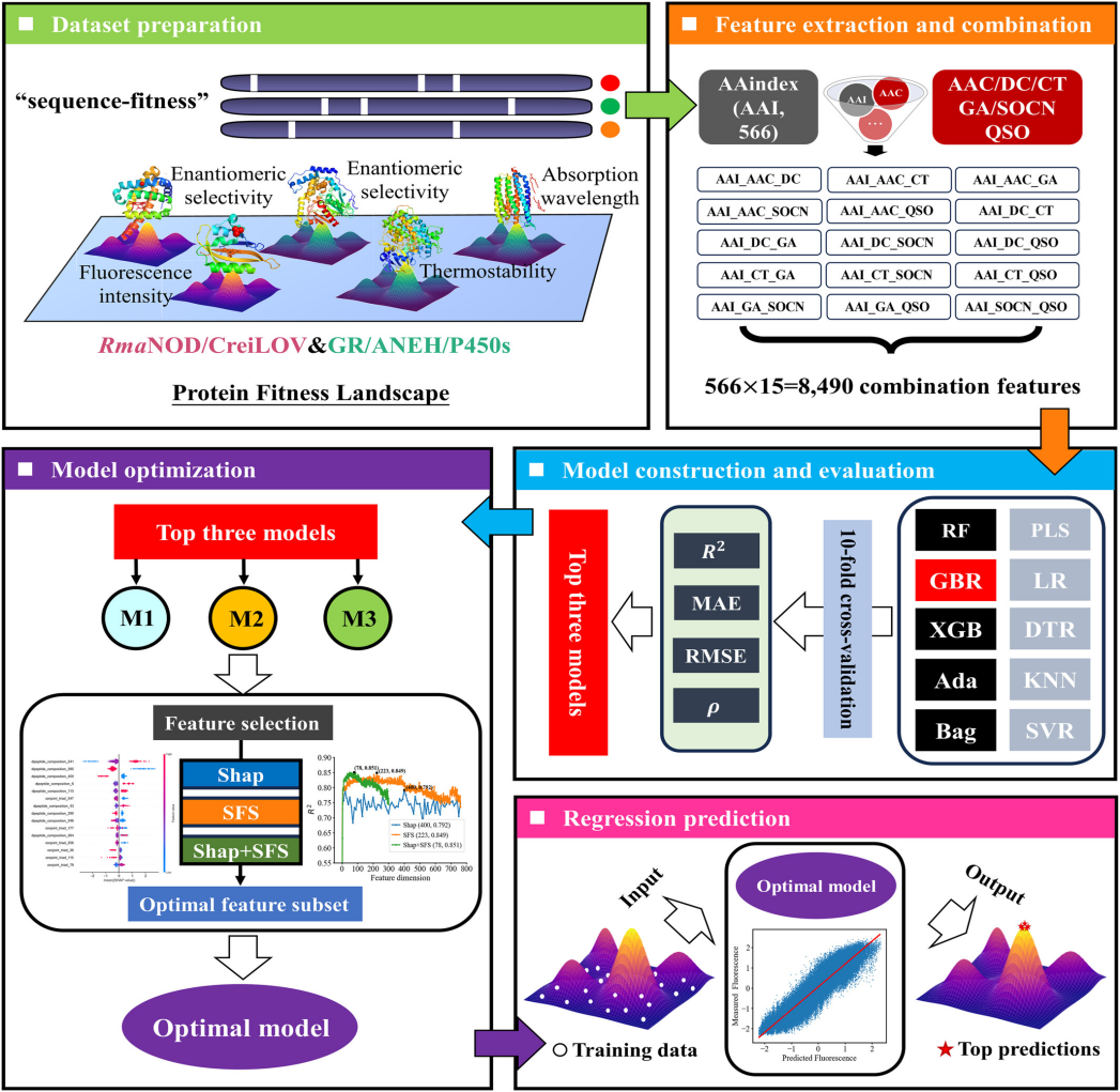 蛋白质氨基酸序列与其功能之间的映射关系可用蛋白质适应度地形表示,寻找解析适应度地形上最高点所对应的氨基酸序列则可能获得进化最优的蛋白,这也是蛋白质改造的目标。然而,多位点变异组合后导致可能的序列数量非常庞大,传统的方法(如定向进化)难以全面探索,容易陷入局部最优。近年来,数据驱动的机器学习为探索适应度地形提供了新的可能。但如何从有限的蛋白质序列中提取关键特征,以优化模型性能,仍是一个亟待解决的问题。