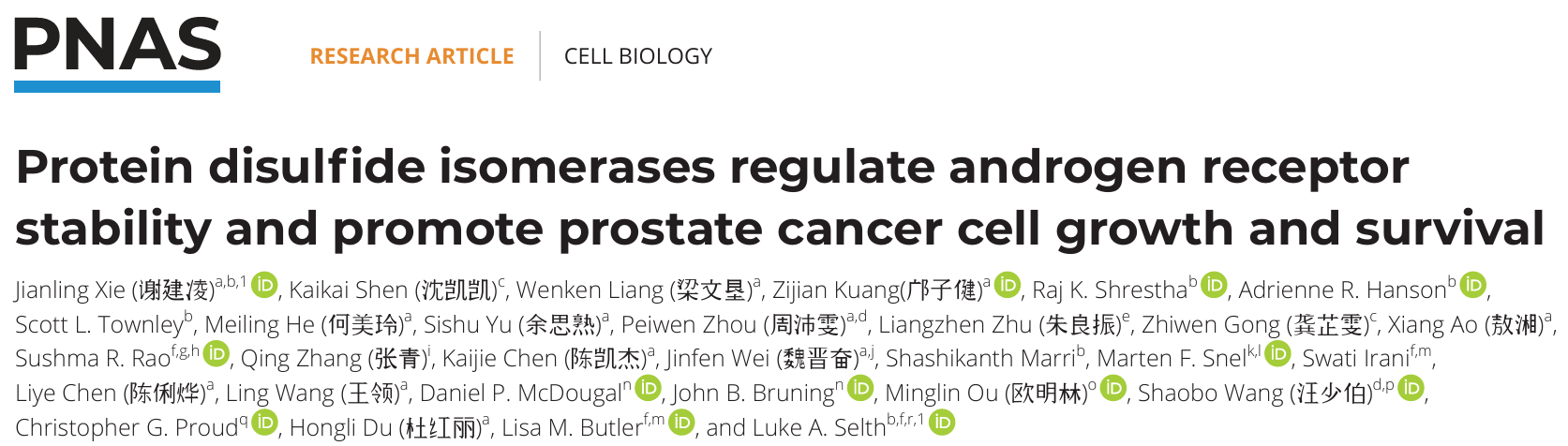 近日,华南理工大学生物科学与工程学院谢建凌、王领、杜红丽三位教授团队在国际著名期刊Proceedings of the National Academy of Sciences(PNAS)上在线发表题目为“Protein disulphide isomerases regulate androgen receptor stability and promote prostate cancer cell growth and survival ”的研究论文,其发现了可以通过靶向调控癌细胞内蛋白质二硫键的形成治疗前列腺癌。华南理工大学生物科学与工程学院谢建凌教授为该论文的第一兼通讯作者。华南理工大学生物科学与工程学院为第一通讯单位。