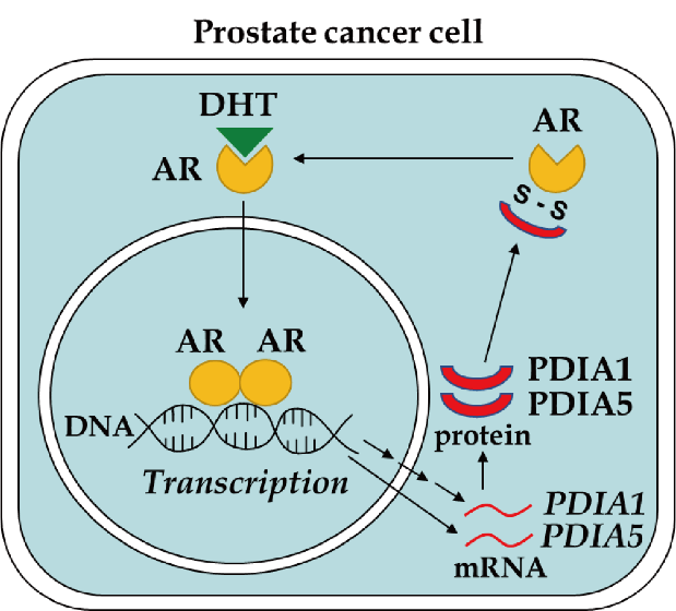 图1:PDIA与AR之间存在正反馈回路。(A)PDIA催化蛋白质二硫键形成示意图。(B)PDIA与AR形成一种正反馈调控示意图。
