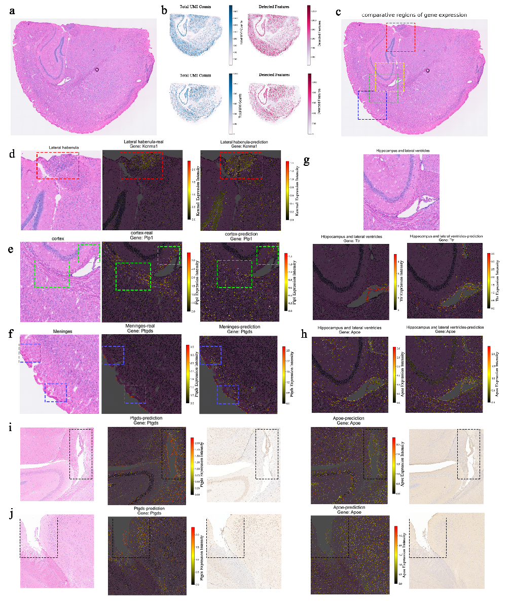 研究团队利用公开的Visium HD数据训练模型,并在多个独立样本中展示其预测效果。结果显示,PRTS为鼠脑切片生成了数万个细胞图块的基因表达数据,空间分辨率较普通空间转录组明显提升。在测试切片中,PRTS预测的表达模式与真实测序数据高度一致,多个关键基因的空间分布与已知生物学知识相符(图2)。