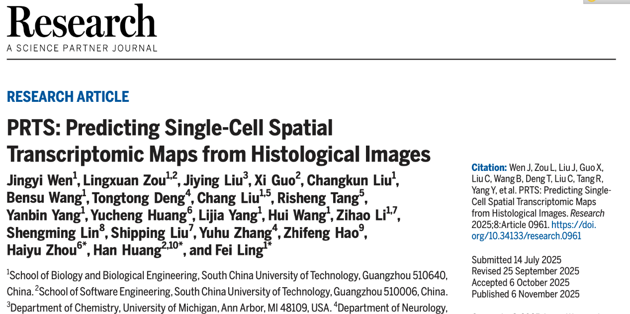 近日,华南理工大学生物科学与工程学院凌飞教授、智能算法中心黄翰教授与广东省人民医院胸外科周海榆教授团队在中国科协主办、与全球顶尖科学协会——美国科学促进会(AAAS,即《Science》杂志的出版方)合办的《Research》(影响因子10.7)期刊上发表了题为《PRTS: Predicting Single-Cell Spatial Transcriptomic Maps from Histological Images》的研究论文,提出了一种名为Pathology-driven Reconstruction of Transcriptomic States(PRTS)的新型深度学习框架,能够直接从H&E染色的组织学图像中预测单细胞级别的空间转录组数据。该方法能够提升或生成高分辨率的预测数据,为低成本、大规模开展空间转录组研究提供了可行方案。本研究由华南理工大学生物科学与工程学院2025届本科生文敬奕(现为清华大学博士研究生)为第一作者,华南理工大学生物科学与工程学院为第一通讯单位。