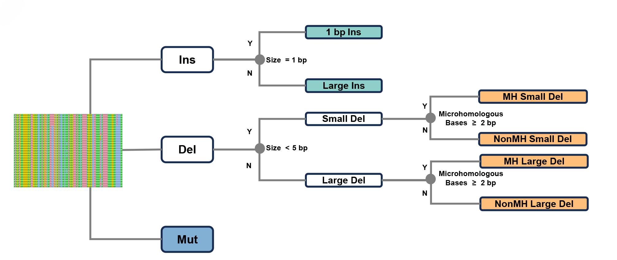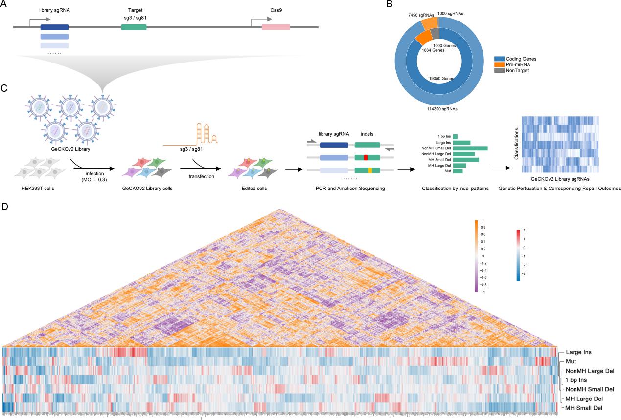 基于前述修复规律性探索,本团队创新性构建了基于规律性修复结局导向的IPGRM(Indel Pattern-Guided Repair Mapping)筛选技术。该技术的核心突破在于:首次将1 bp插入(1 bp Ins)、大片段插入(Large Ins)、无微同源小缺失(NonMH small Del)、无微同源大缺失(NonMH Large Del)、微同源介导小缺失(MH small Del)、微同源介导大缺失(MH Large Del)以及复杂突变(Mut)等七类具有明确分子特征的修复结局,编码为可自动化识别的序列算法模型,实现对单个靶点数百万编辑产物的秒级模式识别与结局分类。这一方法论突破,使本研究首次具备了对不同编辑结局背后的各种修复通路调控因子进行全基因组、无偏倚系统性筛选的能力。与以往传统方法相比,以往大量数据仅能完成中通量基因组筛选,或仅能解析少数具体修复结局;而IPGRM技术在相同测序数据要求的前提下,即可完成全基因组水平的大规模筛选,同时实现对七类修复结局的同步解析,显著提升了筛选通量与解析广度。