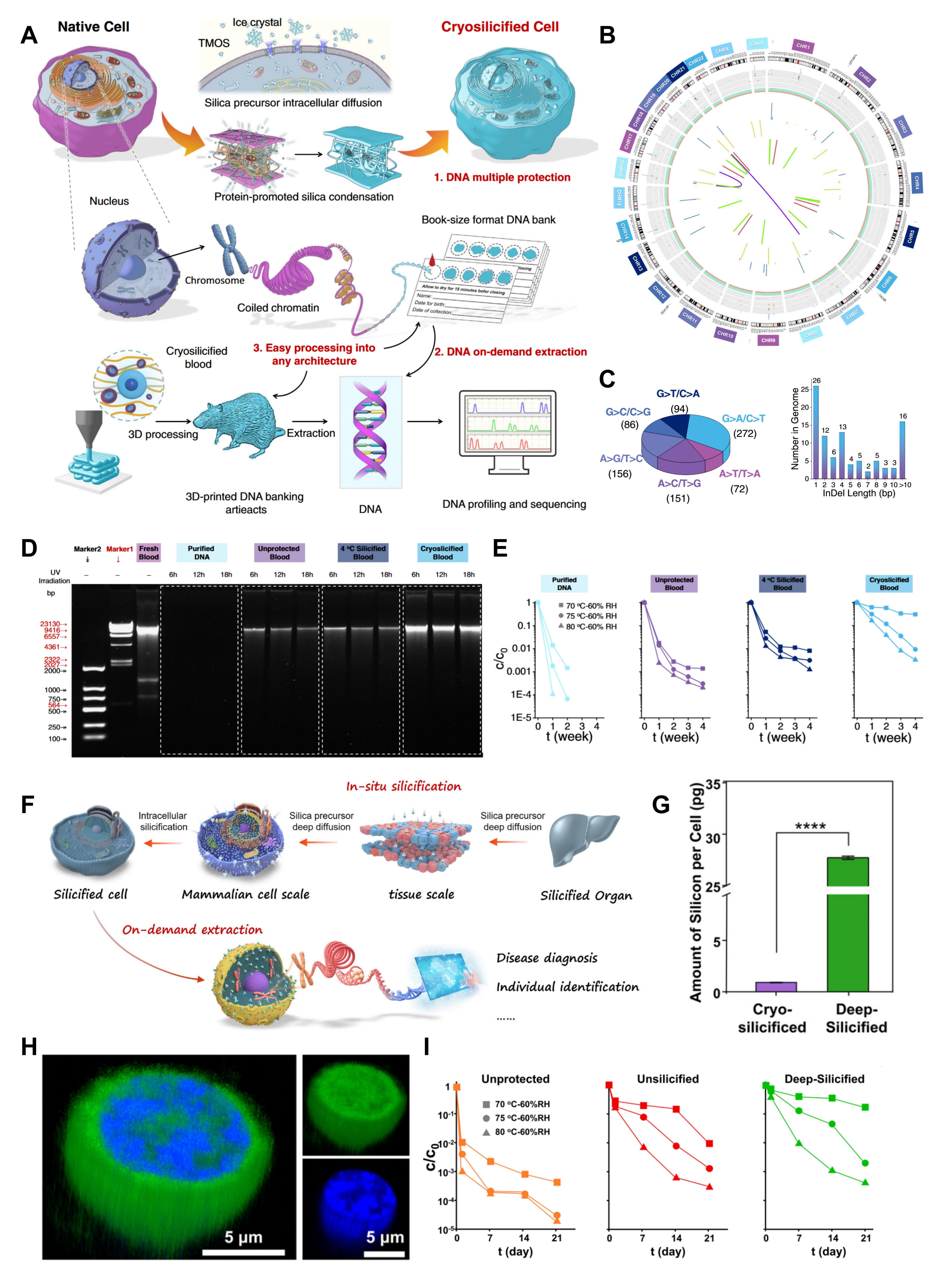 核酸作为遗传信息的核心载体,其稳定保存是维持生物遗传连续性与多样性的关键,而天然DNA结构脆弱,极易受温度、酶解、氧化等因素影响发生降解。核酸尺度的生物硅化,核心是通过冷冻硅化、深度硅化等技术,实现基因组DNA的原位封装与高保真保护。通过优化的硅前体递送策略,正硅酸分子可高效渗透进入细胞与细胞核,在蛋白催化下形成均匀的二氧化硅网络,对全基因组实现360°包裹保护。例如,冷冻硅化技术可将常温环境下基因组DNA的半衰期延长至1208年,是未保护样本的167倍,同时保持极低的基因突变率,甚至低于PCR扩增中Taq酶的错误率;深度硅化技术则实现了从微生物到多细胞生物的跨尺度基因组保存,70℃加速老化3周后,目标基因片段回收率仍超50%,为生物种质资源库、法医样本保存、古基因组研究提供了颠覆性方案。
