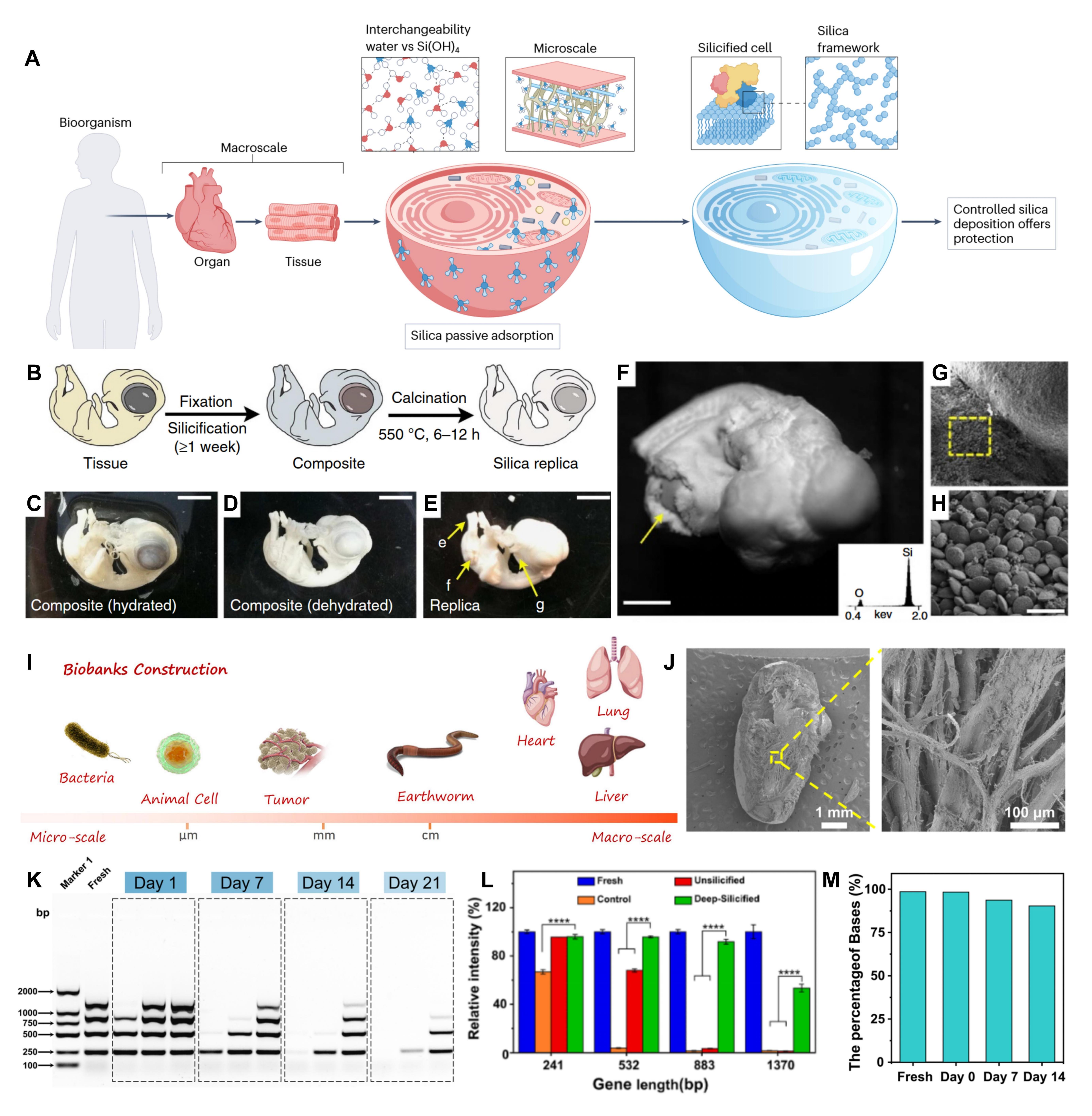 软组织、完整器官与整体生物样本的高保真长期保存,一直是临床病理、生物多样性保护领域的重大挑战,传统固定方法易造成样本结构变形、生物信息丢失、成像伪影等问题。宏观尺度的生物硅化技术,突破了硅前体的组织渗透瓶颈,实现了从离体软组织、完整器官到多细胞模式生物的全结构高保真保存。硅生物复制技术可在鸡胚胎等完整生物样本上形成纳米级均匀硅层,高保真保留从亚细胞超微结构到器官整体形态的全层级生物特征;深度硅化技术则进一步实现了小鼠完整器官、蚯蚓等宏观生物的同步结构与基因组信息保存,常温下样本预计保存寿命近千年,模拟近百年储存后仍能保留96.36%的完整基因组信息,为临床生物样本库、生物种质资源库、博物馆标本保藏提供了全新的技术方案。