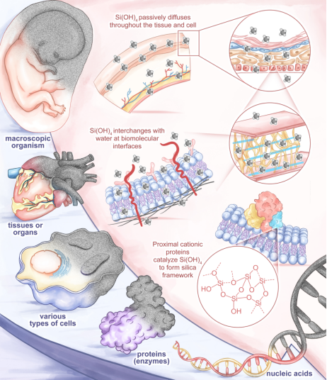 图1. 在不同层级尺度上稳定或功能性演化生物样本的生物硅化技术示意图