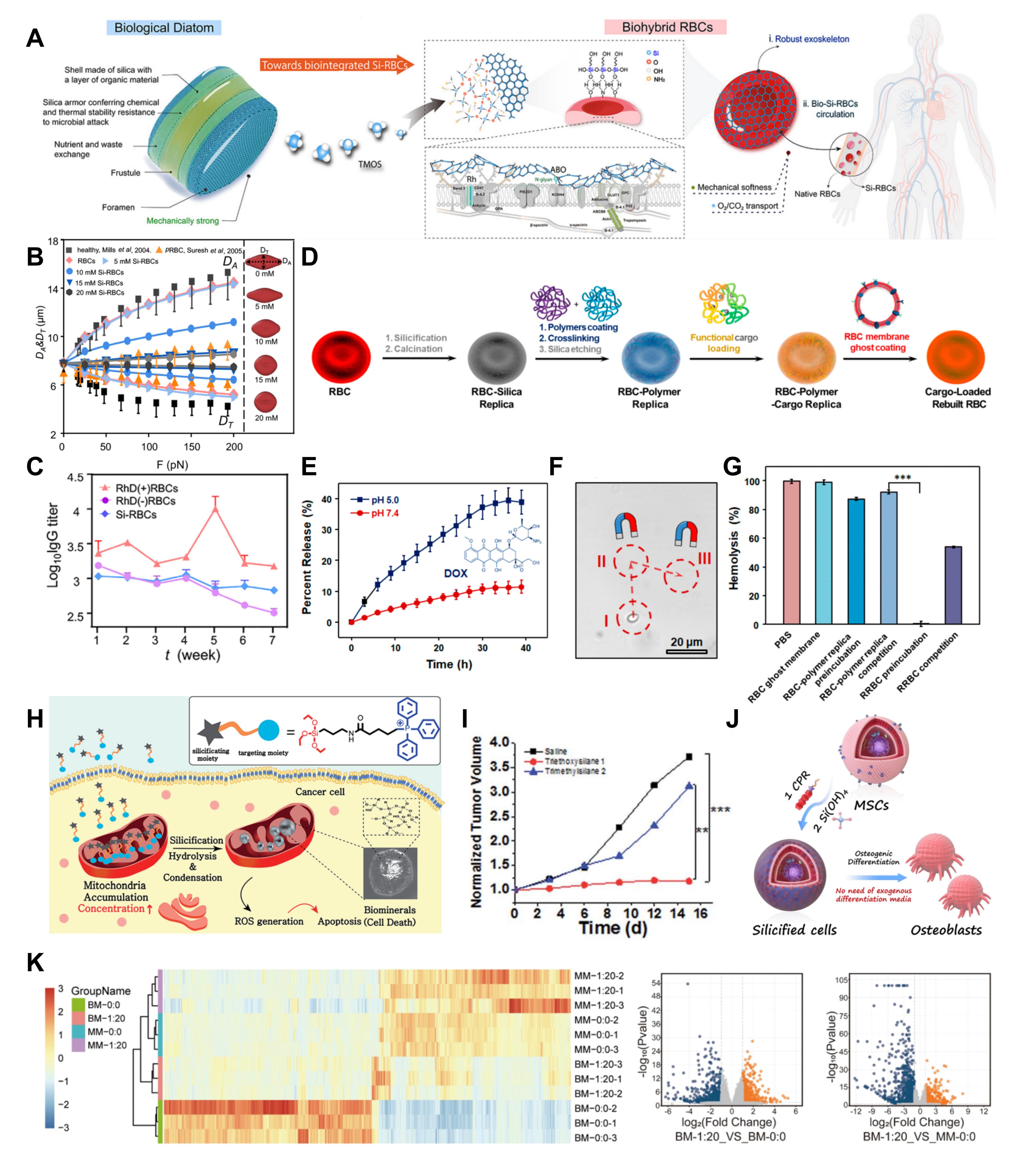细胞是生命结构与功能的基本单位,也是细胞治疗、再生医学、疫苗开发的核心载体,细胞尺度硅化是生物硅化技术最核心的应用场景。通过细胞膜表面或胞内的可控硅化,既能为细胞构建一层“无机铠甲”增强环境耐受性,又能精准调控细胞生理功能与命运走向,适配多元化的生物医药应用。例如,在肿瘤免疫治疗领域,基于硅化技术开发的全细胞肿瘤疫苗,可在室温干燥条件下长期稳定保存肿瘤全抗原,功能化修饰后在小鼠卵巢癌模型中实现了100%的治愈率,单次预防性免疫即可为机体提供完全的肿瘤攻击保护;在输血医学领域,红细胞表面的仿生硅化可有效屏蔽血型抗原,构建出具备通用输注潜力的新型红细胞制品,同时完整保留其携氧能力与体内循环特性;此外,细胞尺度硅化还能实现肿瘤细胞靶向凋亡诱导、间充质干细胞成骨分化定向调控,为再生医学与精准肿瘤治疗提供了全新策略。