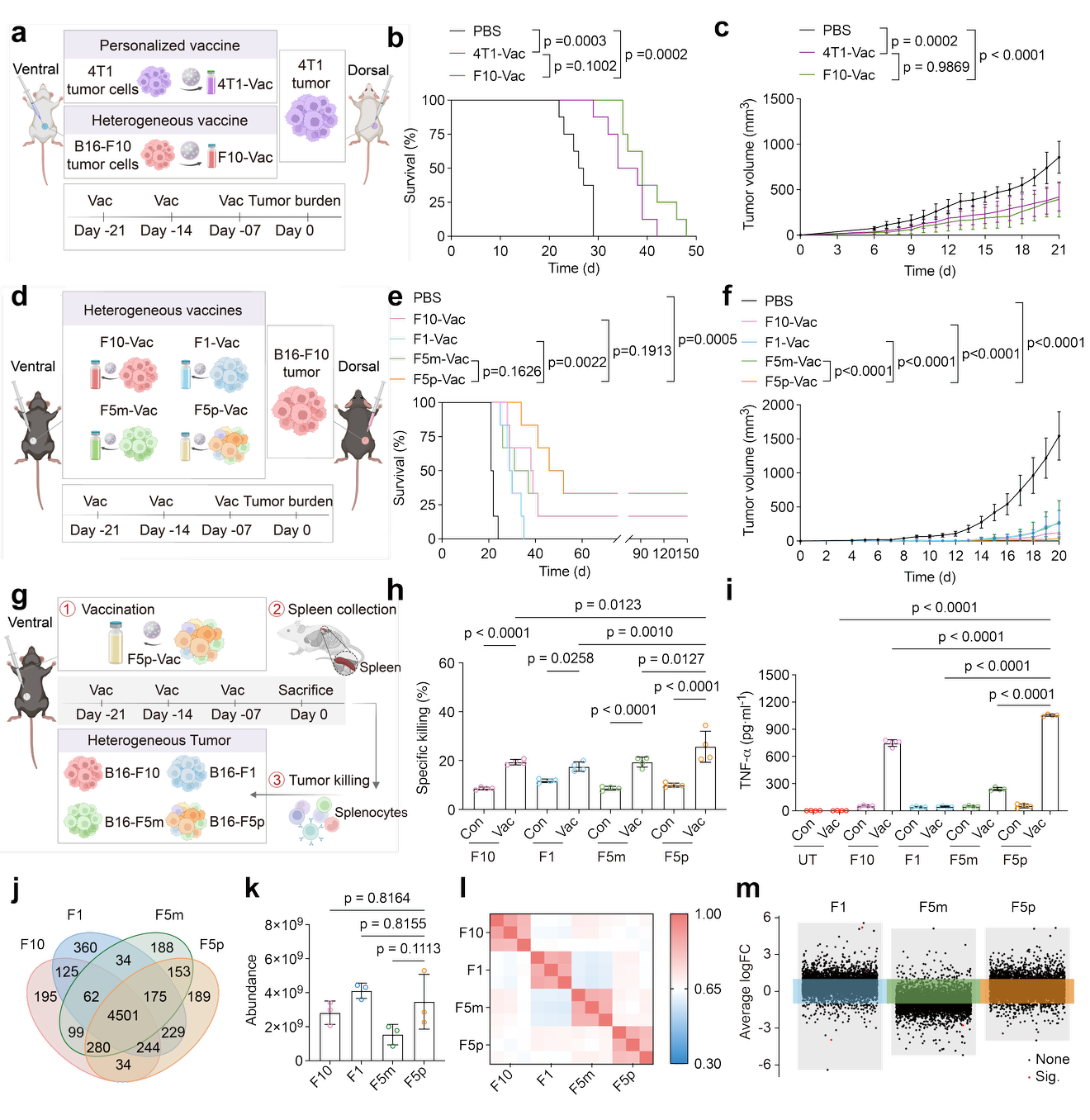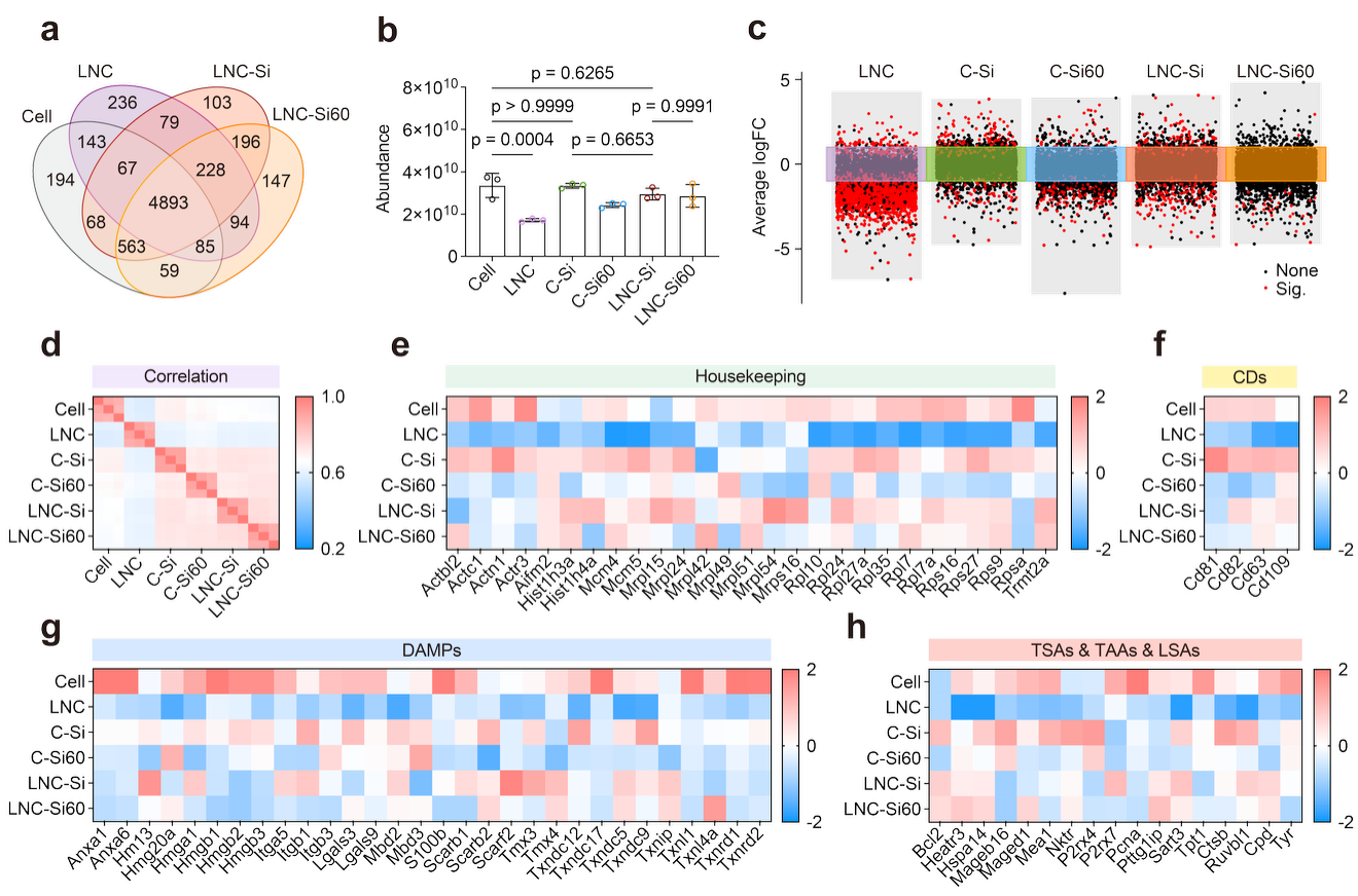 在异质性疫苗广谱预防效果的探究中,团队发现接种个性化疫苗后,个体中位生存期延长35.8%;而接种异质性疫苗后,中位生存期延长47.2%。异质性肿瘤疫苗的预防效果与个性化疫苗相当,支持了其针对肿瘤异质性的广泛适用性。说明仿生强化细胞疫苗不仅可实现个性化的肿瘤预防,还能提供针对侵袭性异质肿瘤亚型的普遍预防性保护,有望预防患者肿瘤复发,并促进健康人群的普适性肿瘤预防。