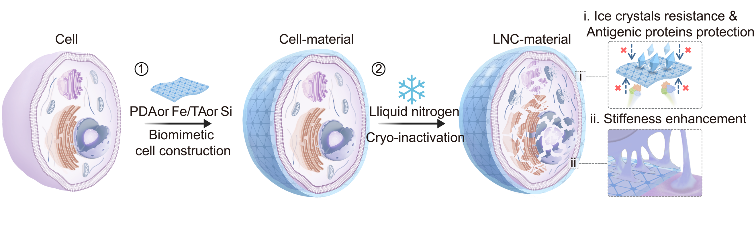 The biomimetic shell protects proteins from mechanical damage induced by ice crystals during vaccine cryopreservation, thereby reducing the loss of immunogenic proteins and maintaining the abundance and diversity of whole-cell antigens. By modulating the mechanical properties of vaccine cells, the shell enables dendritic cells (DCs) to perceive the biomimetically enhanced mechanical stimulation. These mechanical signals are then converted into biochemical signals, activating cellular pathways and regulating DC functions, ultimately improving the efficiency of phagocytosis and antigen presentation of the vaccine cells.
