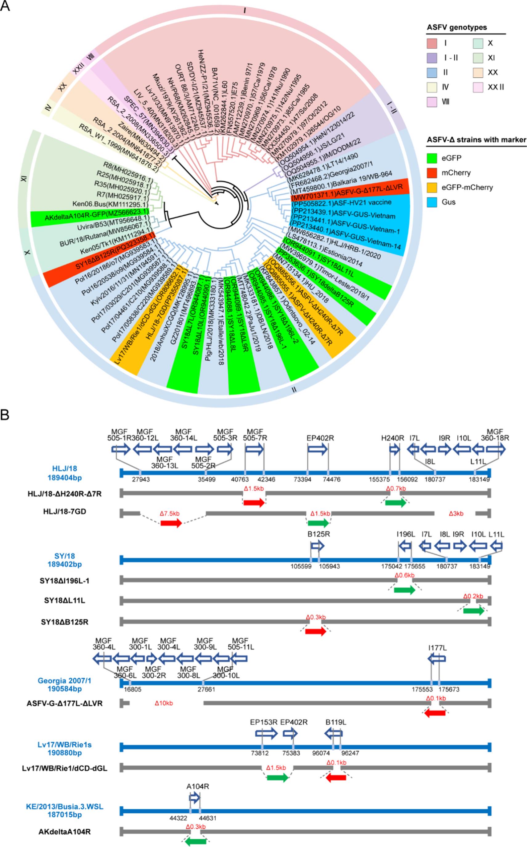 Figure 1. Phylogenetic and genomic characterization of wild-type and gene-deleted ASFV strains.