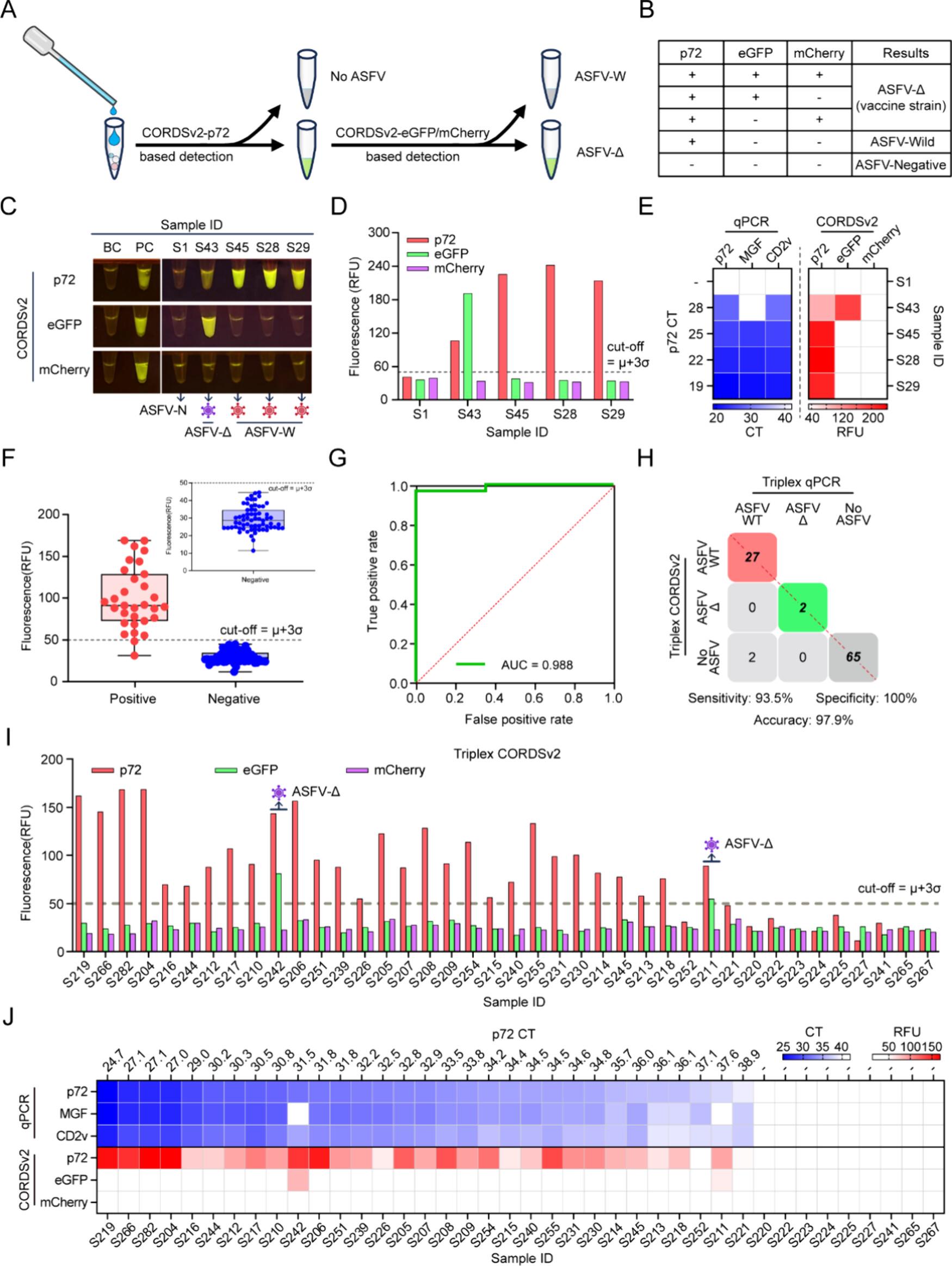 The multiplexed CORDSv2-p72/eGFP/mCherry assay was constructed in this study: the conserved p72 gene was used to determine ASFV positivity, and reporter genes were employed to discriminate wild-type strains from gene-deleted strains. Validation using 96 clinical samples revealed that CORDSv2 exhibited an overall accuracy of 97.9% and a specificity of 100%, showing high consistency with the qPCR gold standard. The assay accurately identified wild-type strains and eGFP-labeled gene-deleted strains without false-positive signals or cross-reactions, completing the entire workflow within 60 min with an error rate below 3%, fully satisfying the requirements for on-site rapid screening and genotyping.