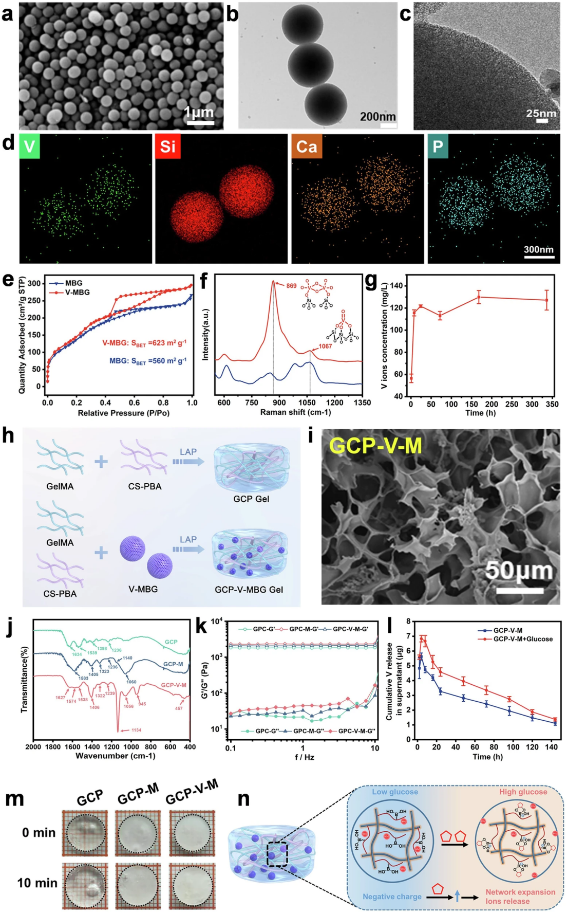 Figure 2. Physicochemical characterization of V-MBG nanospheres and GCP-V-MBG glucose-responsive hydrogel