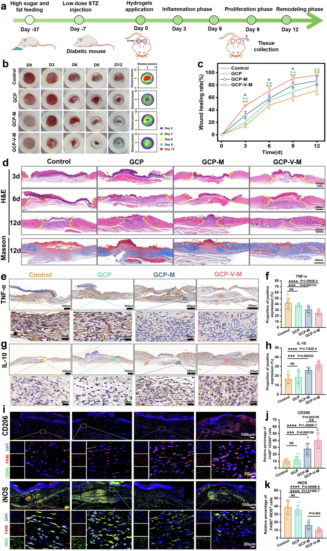 Figure 3. In vivo therapeutic efficacy and mechanistic validation of GCP-V-MBG hydrogel in promoting diabetic wound healing in mice