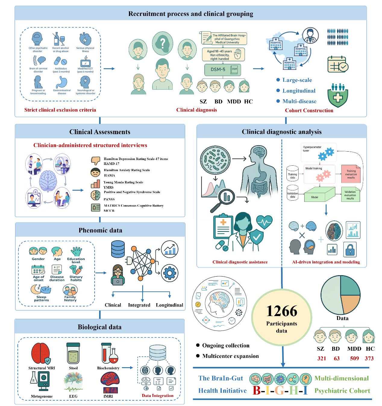 为突破既往精神疾病研究在跨系统整合与个体异质性刻画方面的局限,研究团队基于微生物-肠-脑轴(MGBA)框架建立了中国首个聚焦MGBA的前瞻性精神疾病研究队列BIGHI,系统覆盖精神分裂症、重性抑郁障碍、双相障碍及健康对照人群。目前,队列已完成1200余名受试者的标准化多模态采集,涵盖临床与认知评估、脑电(EEG)、磁共振成像(MRI)、血液生物标志物及肠道宏基因组数据。基于该队列的系列研究从中枢神经功能、脑结构-功能网络、肠道微生物组及跨系统多组学整合等多个层级开展系统分析,初步表明MGBA的失调可能构成多类精神疾病共享的跨诊断生物学基础,并在不同系统层面形成相互印证的生物学线索,为刻画精神疾病的多维异质性及推动精准分型与机制研究提供了统一的数据平台与方法学框架。