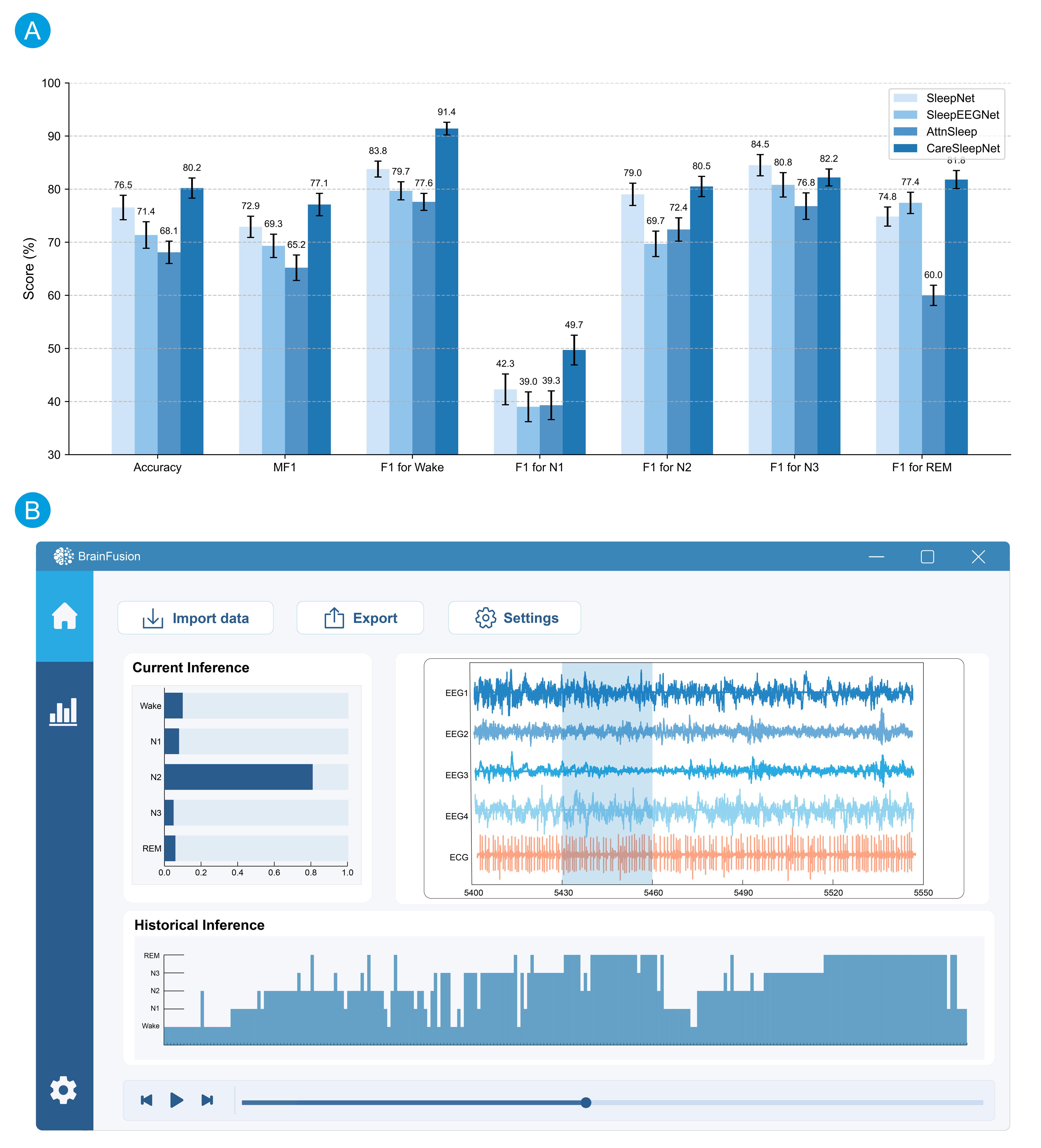 图4.睡眠分期分类结果及生成的应用。 (A) 四种深度学习模型在HMC 数据集上的性能比较,显示了总体准确率、宏观平均 F1分数(mF1)和各睡眠阶段(Wake、N1、N2、N3、REM)的单个 F1 分数的平均值±标准差(SD)。 所有指标均为5交叉验证的平均值。 误差条表示平均值的一个SD值。 (B)生成的应用原型的用户界面,支持睡眠阶段预测、概率得分可视化和历史推理跟踪。