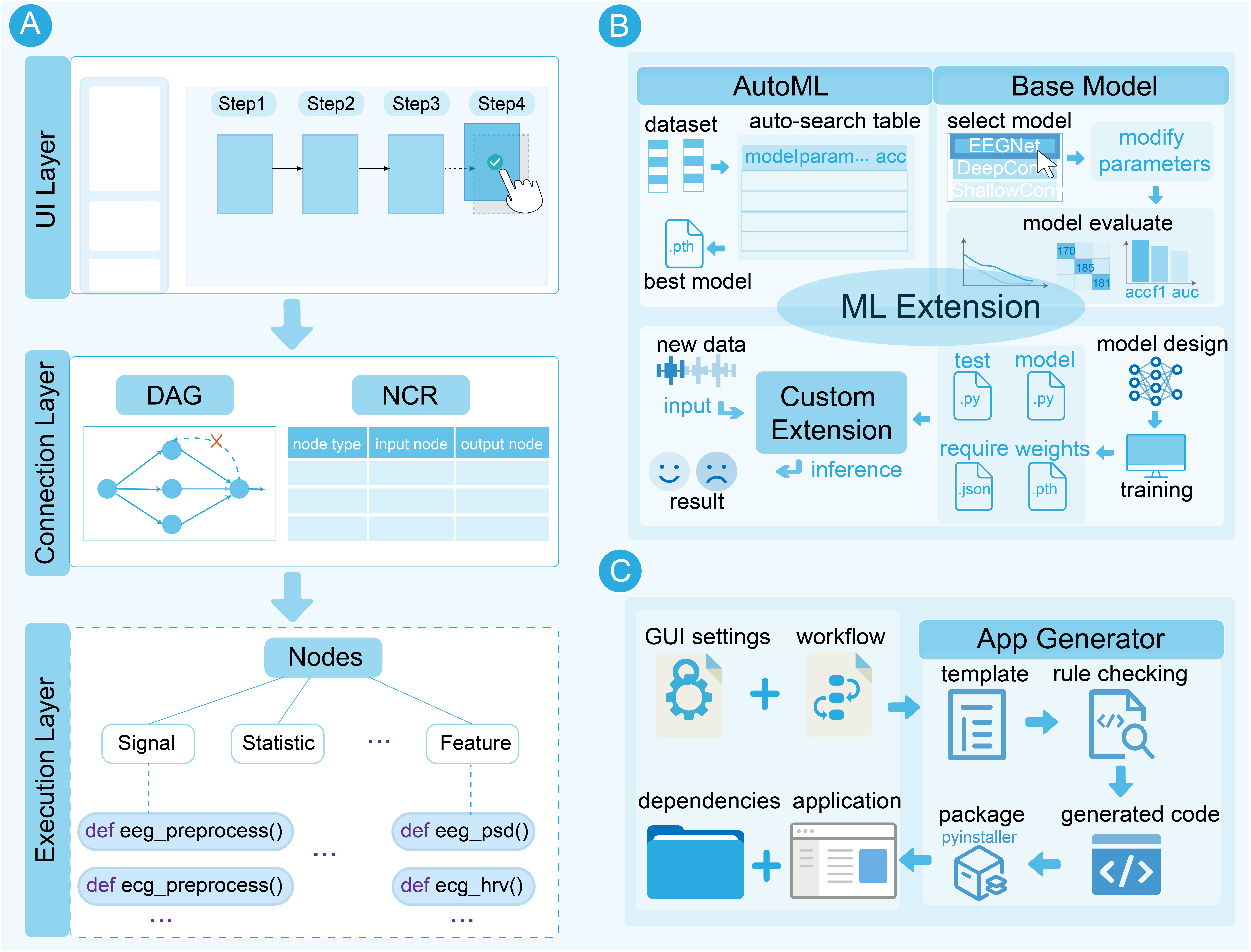 图3.BrainFusion 三个主要功能模块。 (A)一键式工作流设计器包括用于拖放工作流配置的用户界面层、用于确保符合DAG 结构和节点连接验证的连接层,以及由模块化功能节点组成的执行层。 (B)机器学习扩展框架支持基于AutoML 的传统模型选择、深度学习基准测试以及通过外部模型接口集成用户自定义模型。 (C)应用程序生成器可将工作流转换为带有图形用户界面的独立可执行应用程序,从而实现快速部署和演示。