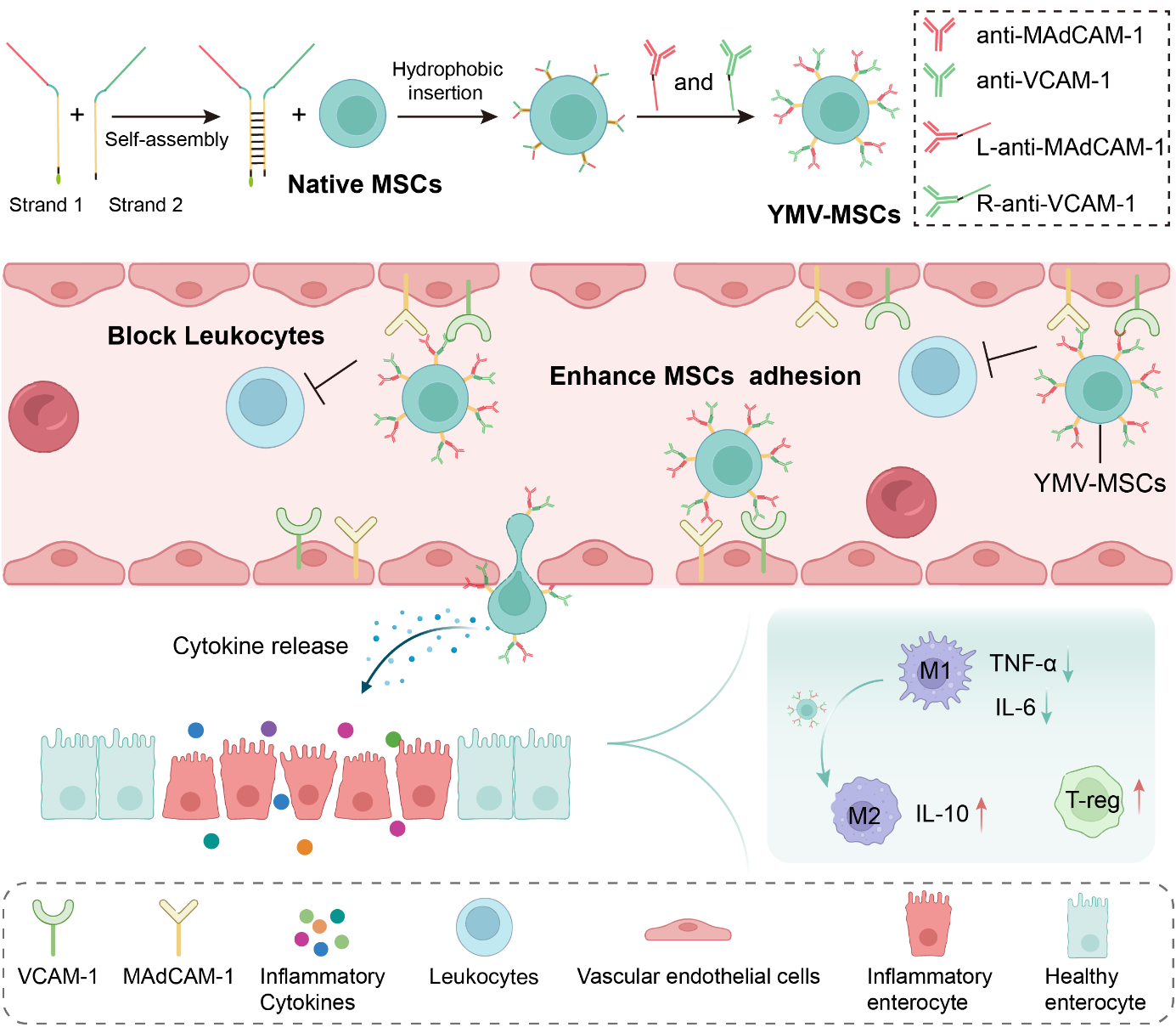 基于此,华南理工大学石鹏课题组提出了一种创新的双特异性抗体-细胞偶联策略。研究团队利用DNA自组装技术,将促进MSCs靶向归巢的抗VCAM-1抗体与阻断白细胞归巢的抗MAdCAM-1抗体整合至同一DNA支架中,构建出具有双功能的抗体复合物。DNA支架可以确保抗体从细胞膜表面空间延伸,减少非特异性相互作用和空间位阻,进而保持抗体的高结合亲和力,同时避免了化学偶联所带来的异质性问题。