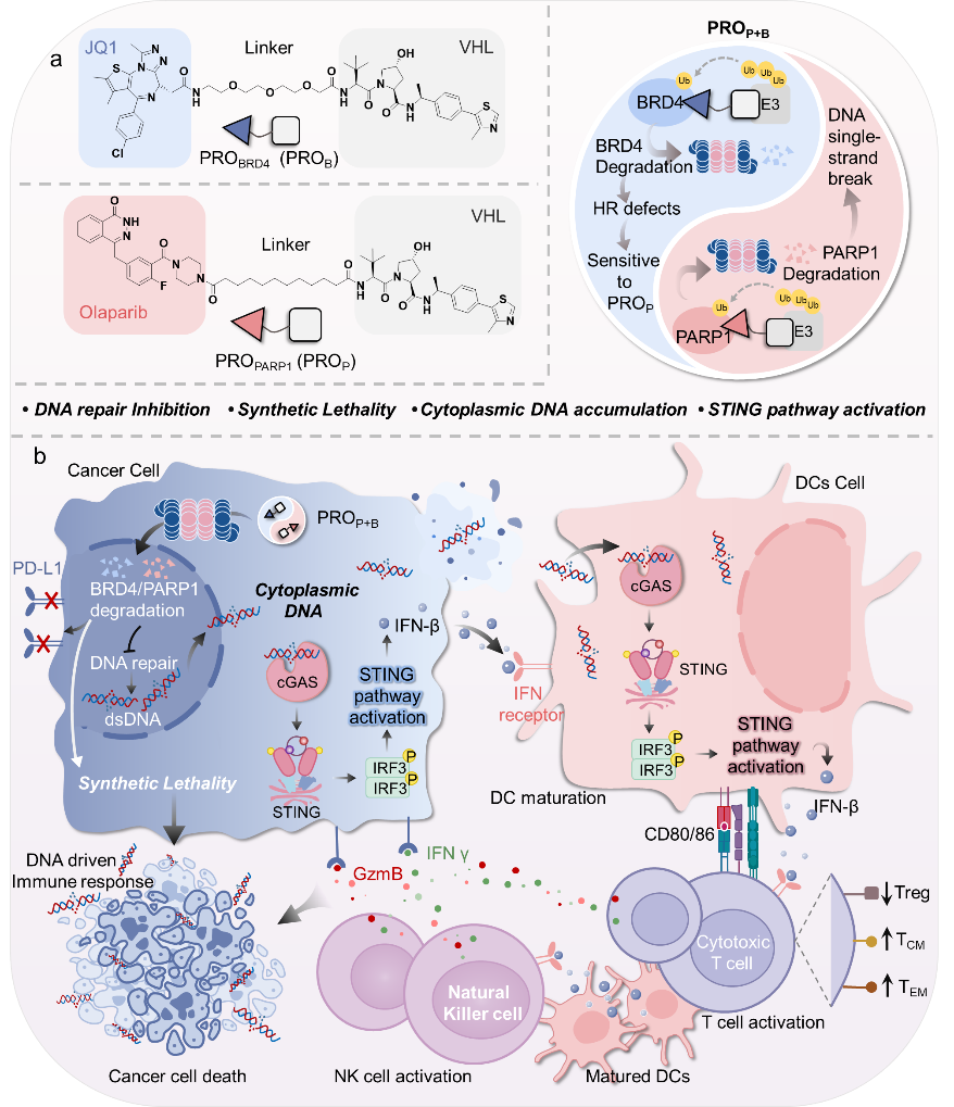 为此,研究团队提出了一种治疗策略:利用蛋白降解靶向嵌合体(PROTAC)技术,介导聚ADP-核糖聚合酶1(PARP1)和含溴结构域蛋白4(BRD4)的降解以诱发“合成致死”效应。该效应能够破坏肿瘤的DNA修复机制,促使DNA从细胞核向细胞质内泄漏;当泄漏量突破STING的激活阈值时,即可有效触发由cGAS-STING通路介导的先天免疫反应。在多种肿瘤模型中,该策略均展现出卓越的抗肿瘤功效:它不仅能激发由CD8⁺T细胞和NK细胞介导的强效免疫反应,还能显著抑制肿瘤的肺部转移进程。这种将合成致死机制与免疫原性应激反应有机结合的策略,建立了一种前所未有的全新范式,为进一步拓展cGAS-STING介导的先天免疫的广泛应用奠定了基础。(通讯员:袁友永教授课题组)