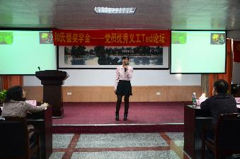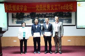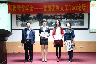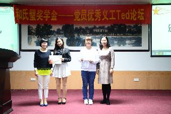 2014年11月19日下午,我院首届“和氏璧奖学金——优秀党员义工TED论坛”、一场别开生面的大型党员组织生活在我院逸夫工程馆四楼会议厅举行。论坛现场邀请到了和氏璧化工董事副总裁兼南区C00 蔡芾女士、南区大客户总监卢志洪先生、工程塑料事业部南区总监王文女士等来自企业的代表,我院党委徐兵书记、吴妙娴副书记、校党委组织部代表胡一平老师、学院关工委、离退休党支部代表高桂田老师、叶招菊老师、学院教工党支部代表李琼老师、优秀班主任代表马四朋老师、学院办公室党支部代表夏雪峰老师以及来自全院各研究生、本科生党支部的党员同学们一起参与了本次论坛。