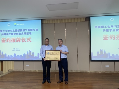 与会领导和师生的共同见证下,化学与化工学院党委副书记刘才刚与东莞新奥总经理助理张海亚签订校企合作协议书,正式开启校企合作新篇章。随后,华南理工大学化学与化工学院党委书记许国民为此次校企合作实践基地授牌,东莞新奥总经理鲁统山代表公司接牌。