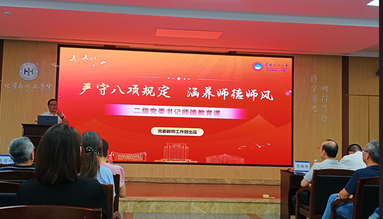 学院党委书记郑存辉首先传达了学校《关于开展2025年师德教育活动的通知》,围绕落实立德树人根本任务,大力弘扬教育家精神,通过开展师德教育活动,坚决落实师德师风第一标准,加强教师队伍思想政治建设,全员全方位全过程强化师德养成,引导广大教师自觉践行为党育人、为国育才的初心使命,营造风清气正的育人环境。郑书记以“严守八项规定,涵养师德师风”为主题开展师德教育课,引导教师筑牢思想防线,塑造优良教风学风。